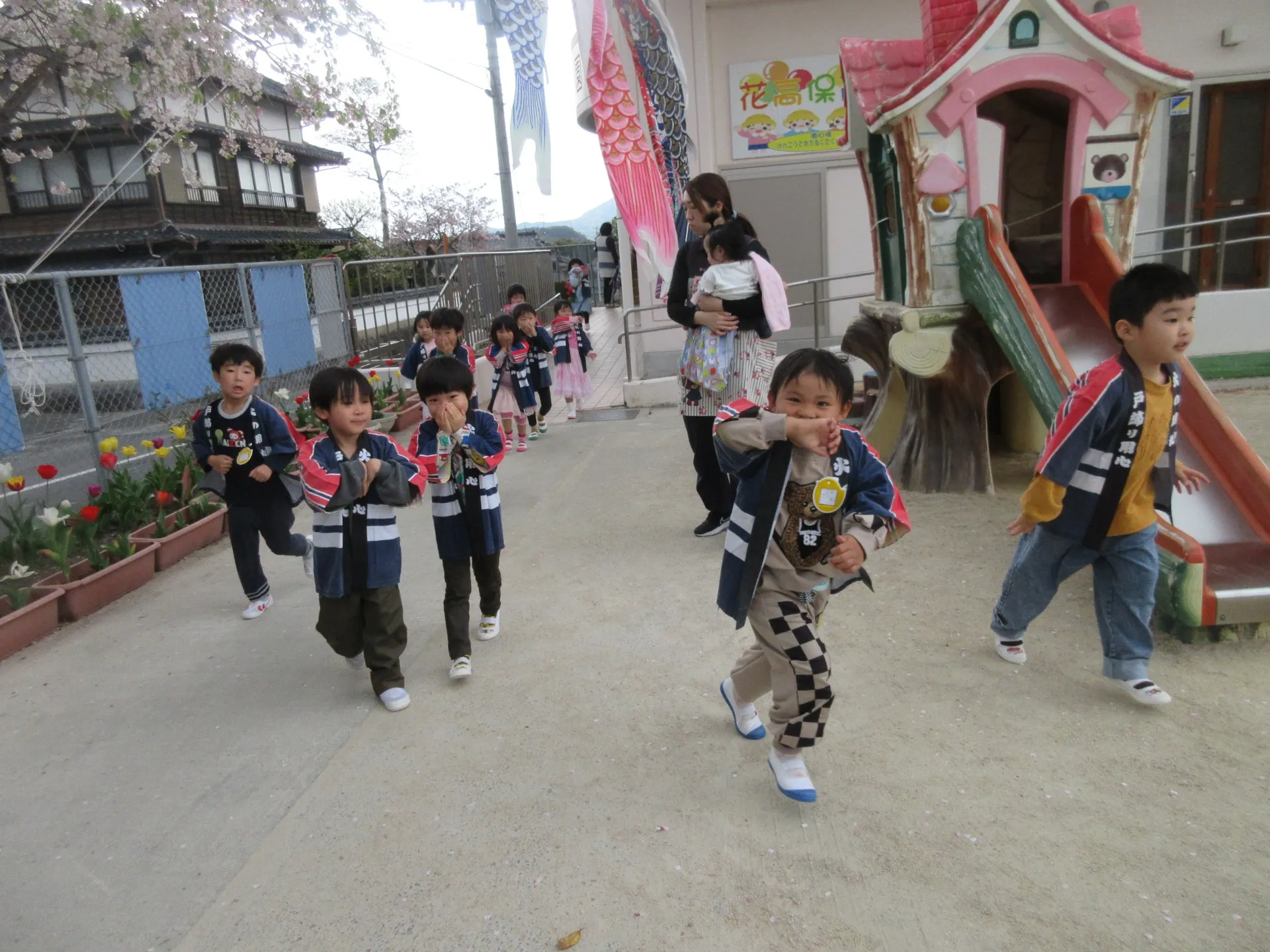 すみれ大組さんは避難車だったのが自分で歩いての避難になり、ばら組さんは2階から階段での避難になるなど大きく変わる所がありましたが、素早く安全に避難することが出来ていました✨A組さんも法被を着て、煙を吸わないように口元を押さえ、「お」おさない・「か」かけない・「し」しゃべらない・「も」もどらない の約束もしっかり覚えて避難することが出来ていましたよ😄