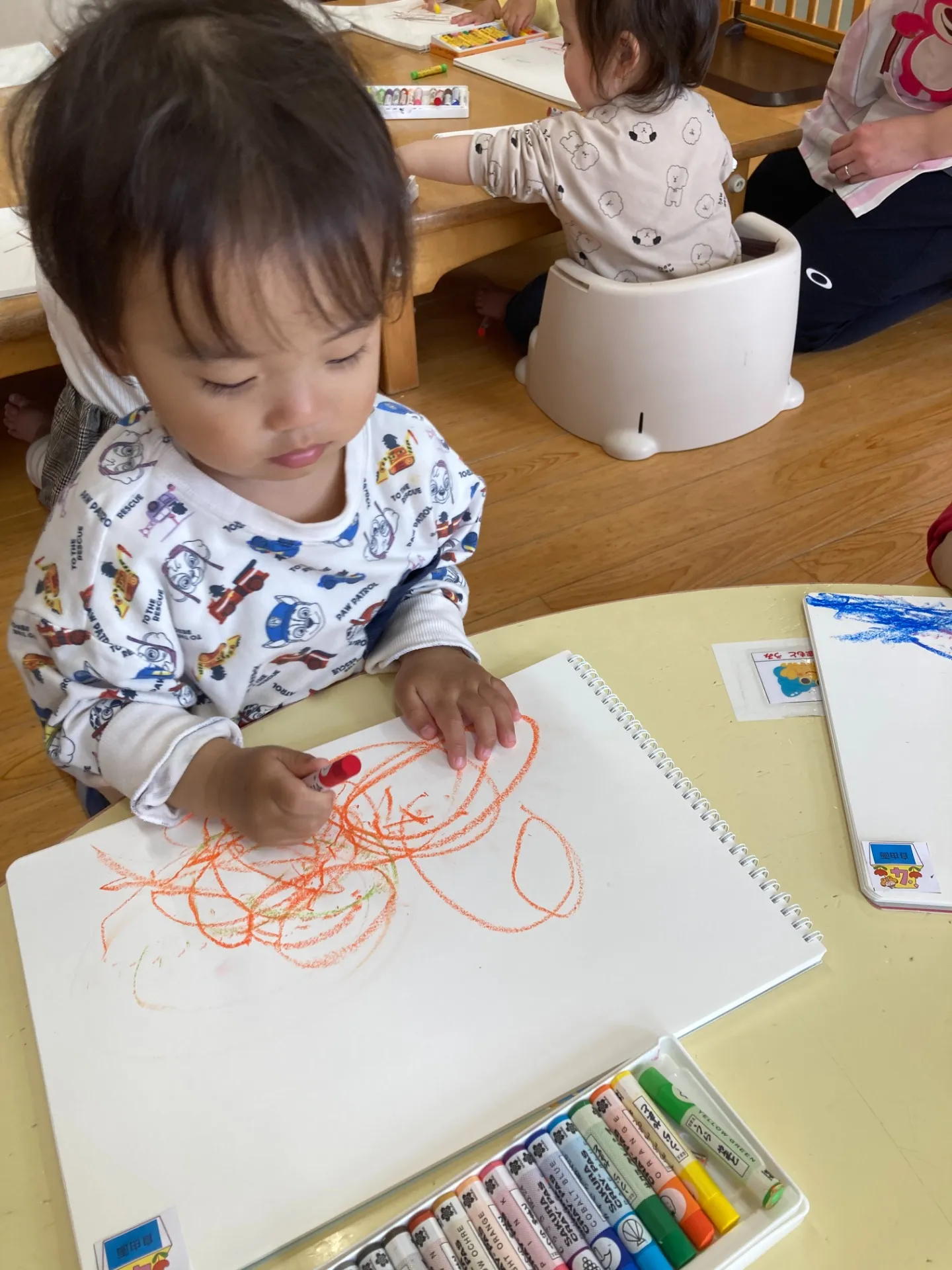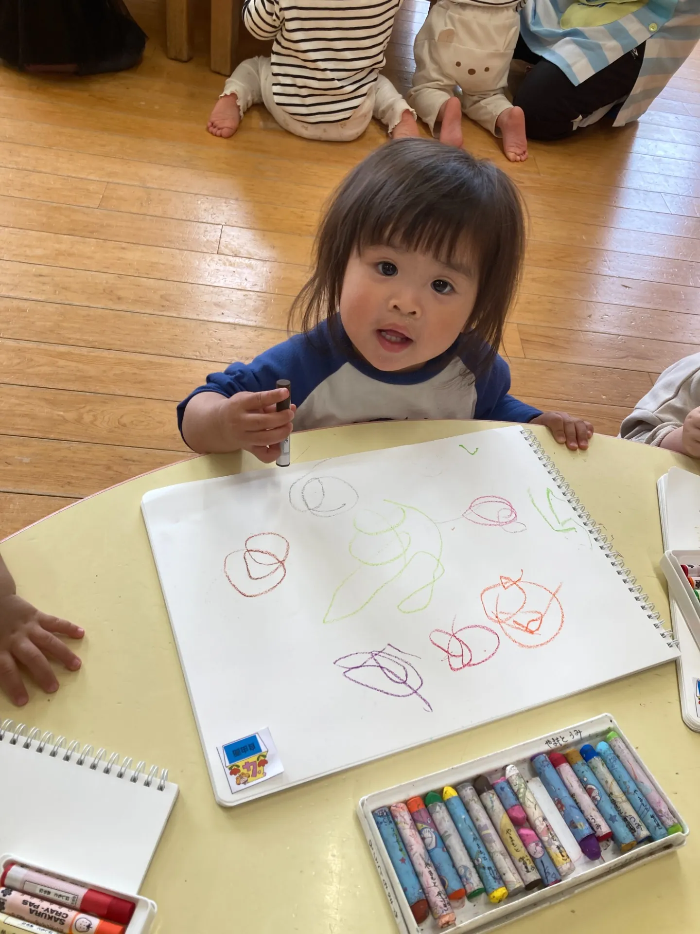 新品の自由画帳を子ども達の前に置くと、みんな座って待っていましたよ。クレパスを開けて持たせてあげると可愛い手指で持って自分でグルグルーっと描いていました。真剣な表情がとても可愛らしかったのですよ。💖