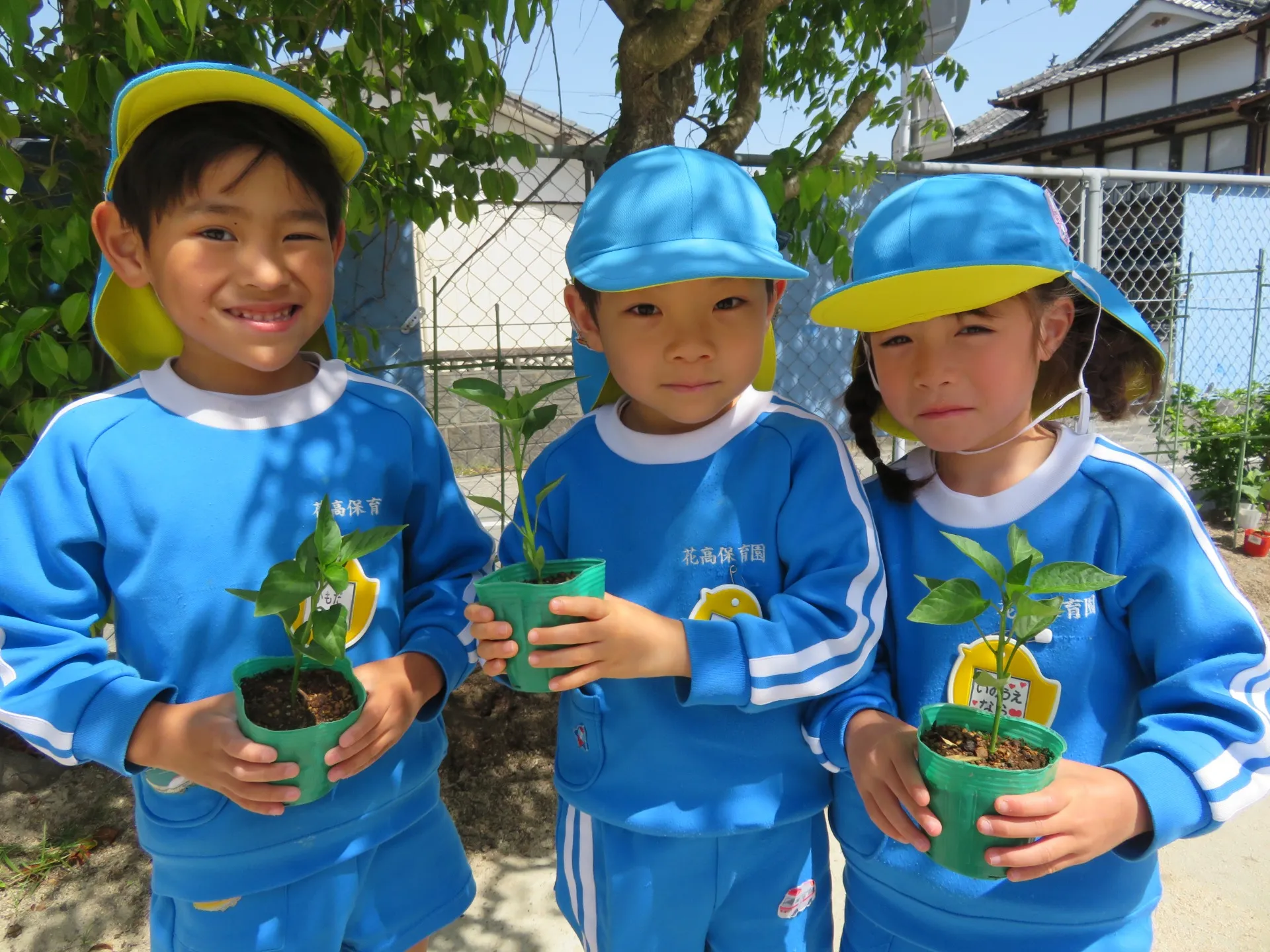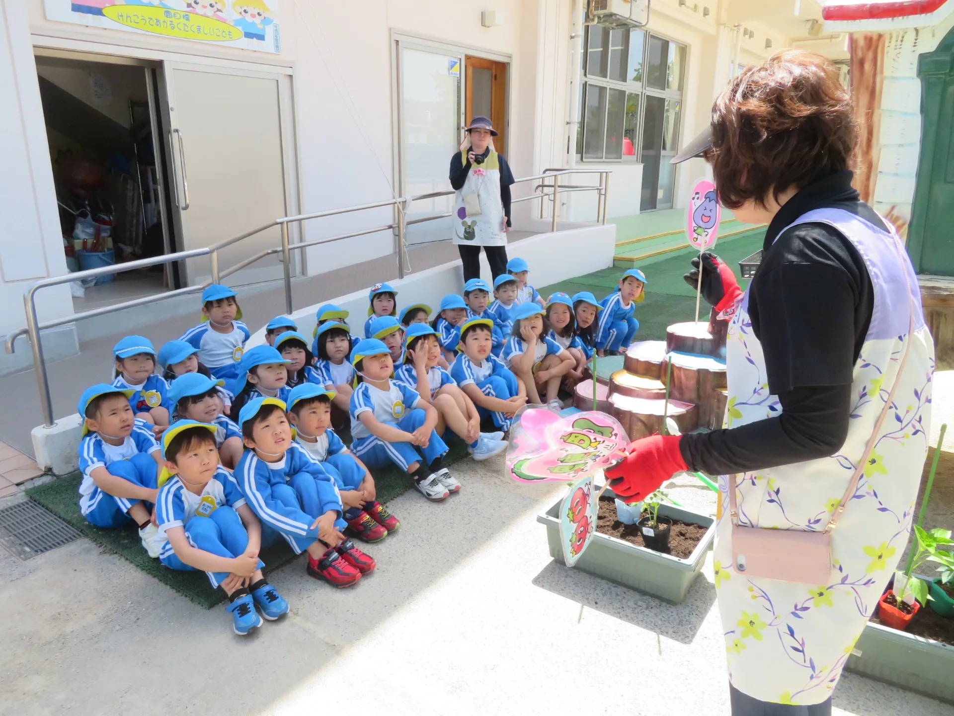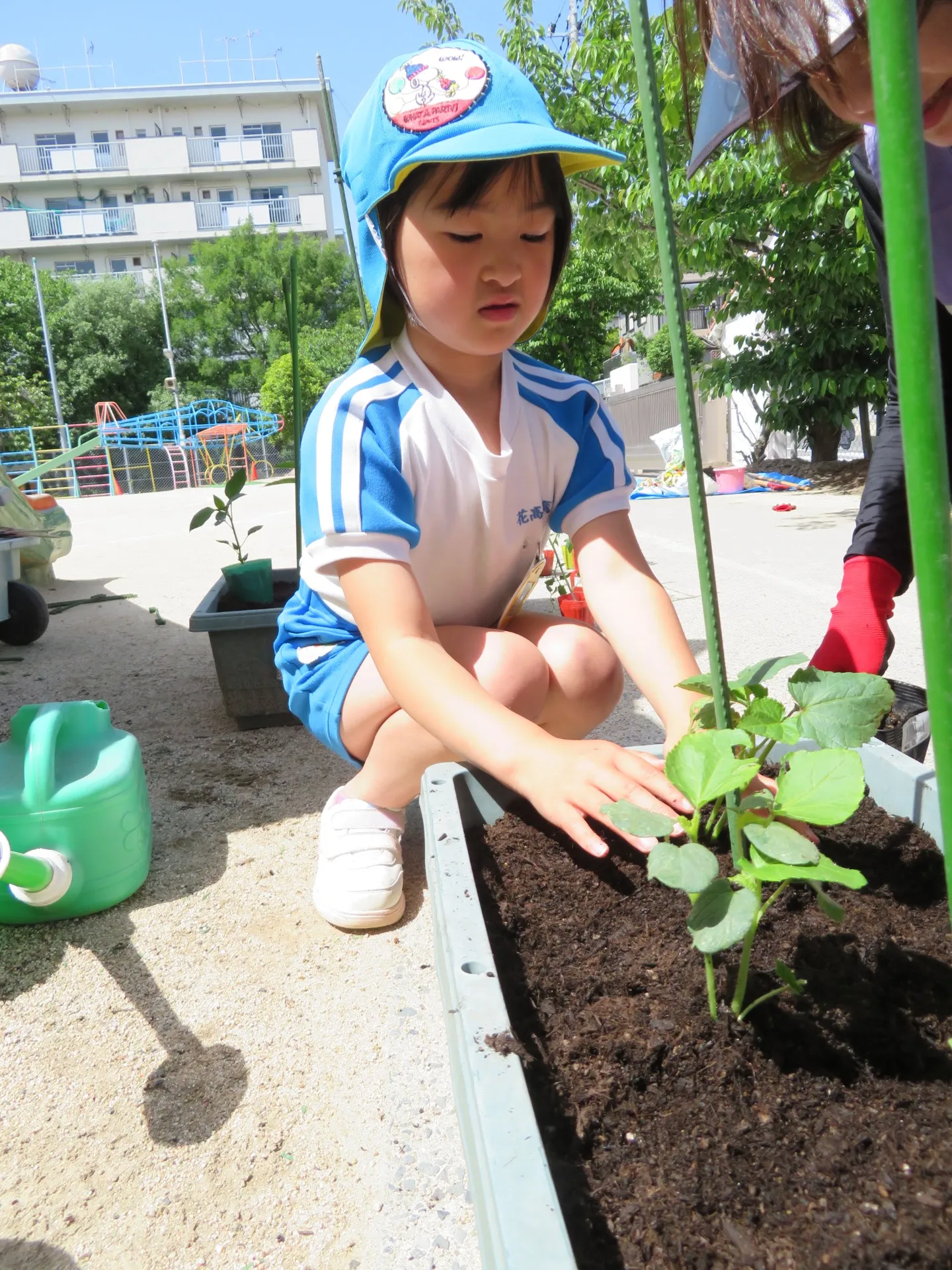 園庭の横の畑とプランター前に集まり夏野菜のお話しを聞いて、子ども達は、キュウリ、ナス、オクラ、ピーマン、トマトの苗を植えました。