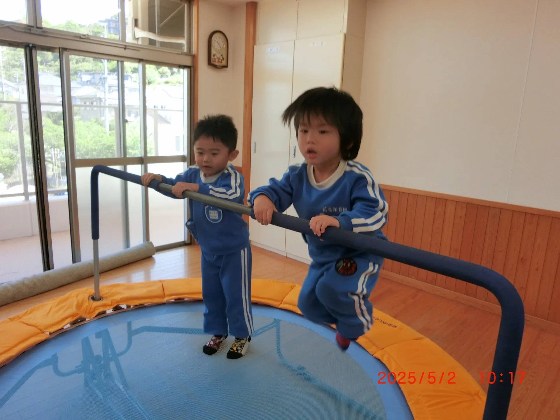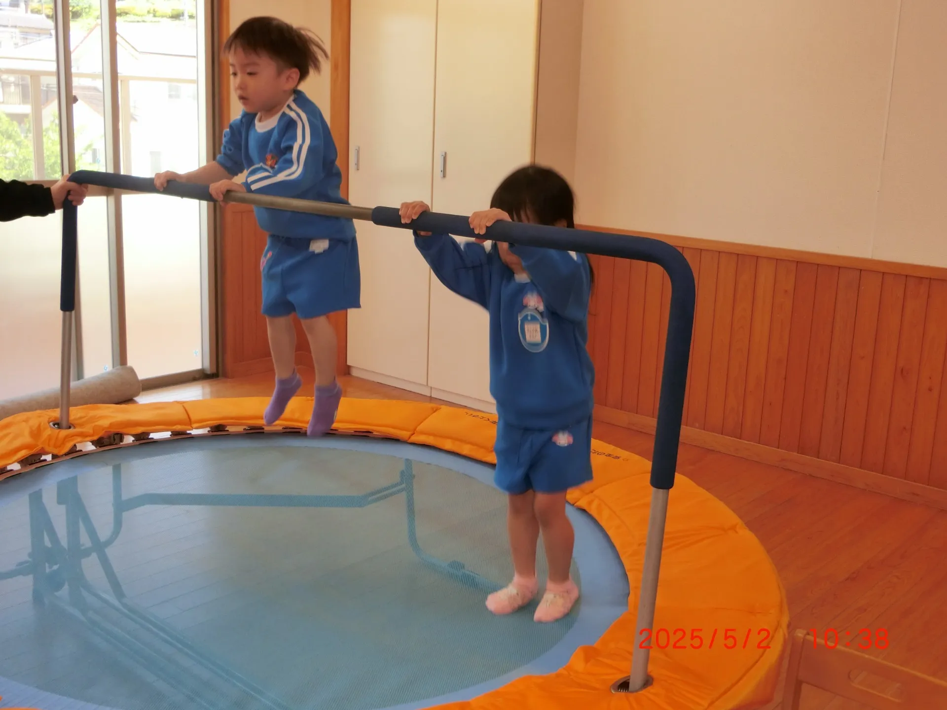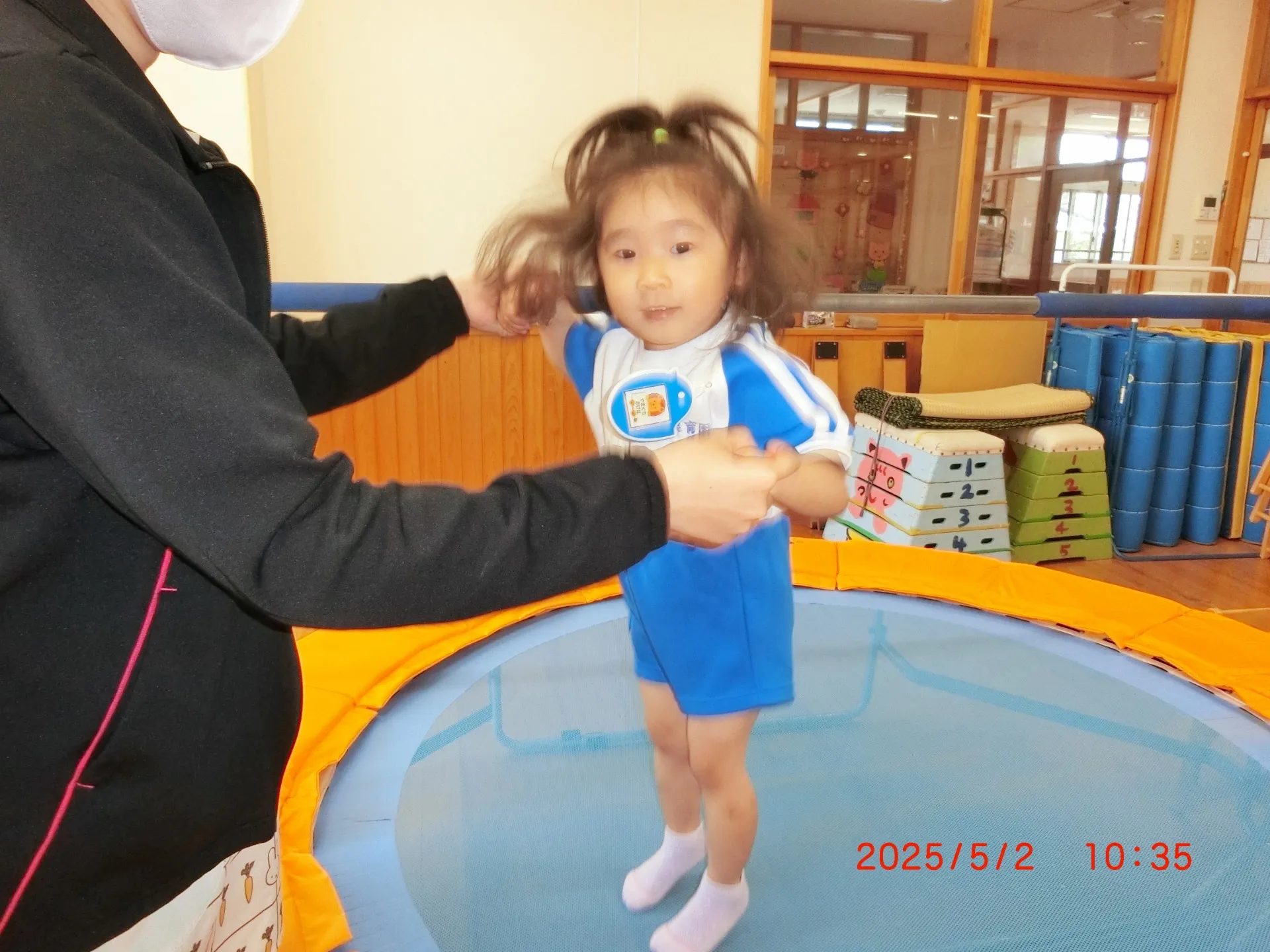 少し前のことですが、トランポリンを楽しみました😄「トランポリンで遊ぶよ」と言うと「イエーー!!😆」と歓声を上げていた子ども達です。ポヨポヨ弾む面は不安定で、恐る恐るなお友だちは先生に両手を支えてもらって小さくジャンプをしました。怖いもの知らずで大胆なお友だちもいて大ジャンプを披露してくれましたよ。「もう一回もう一回」と何度も楽しんだばら組さんでした✌