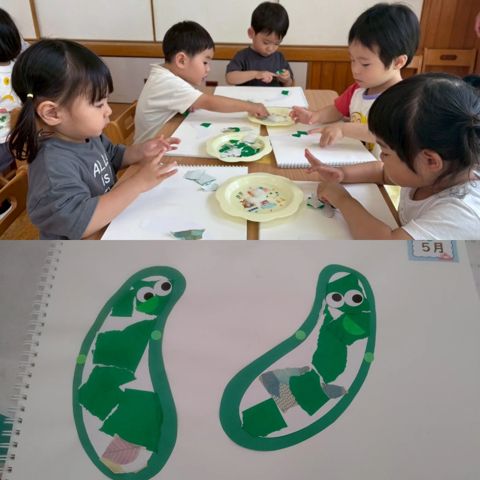 5月の製作でもキュウリ作り♪糊貼りをみんな真剣な表情で取り組めていました😊