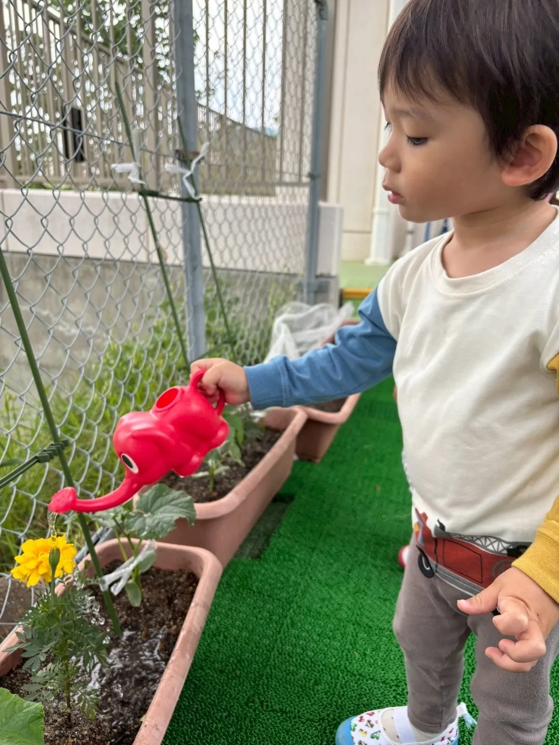 そして、水やりも交代でしましたよ♪テラスに出て、大きくなぁれ!大きくなぁれ!とみんなで声掛け♡