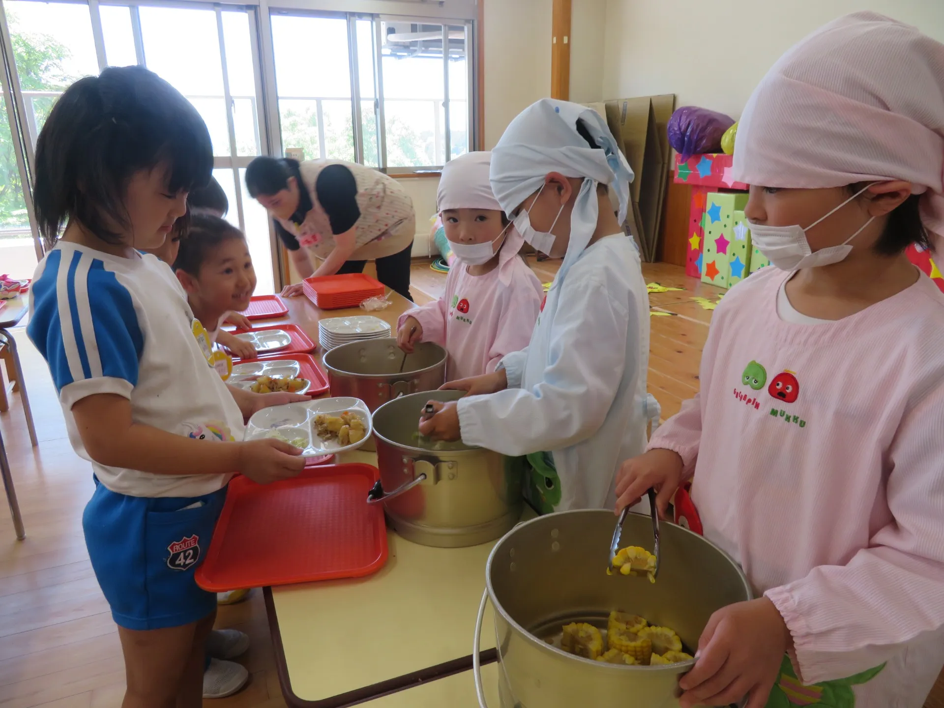 男の子は水色・女の子はピンク色の給食着を着て、三角巾・マスクを付けてヤル気満々で頑張っています✨
