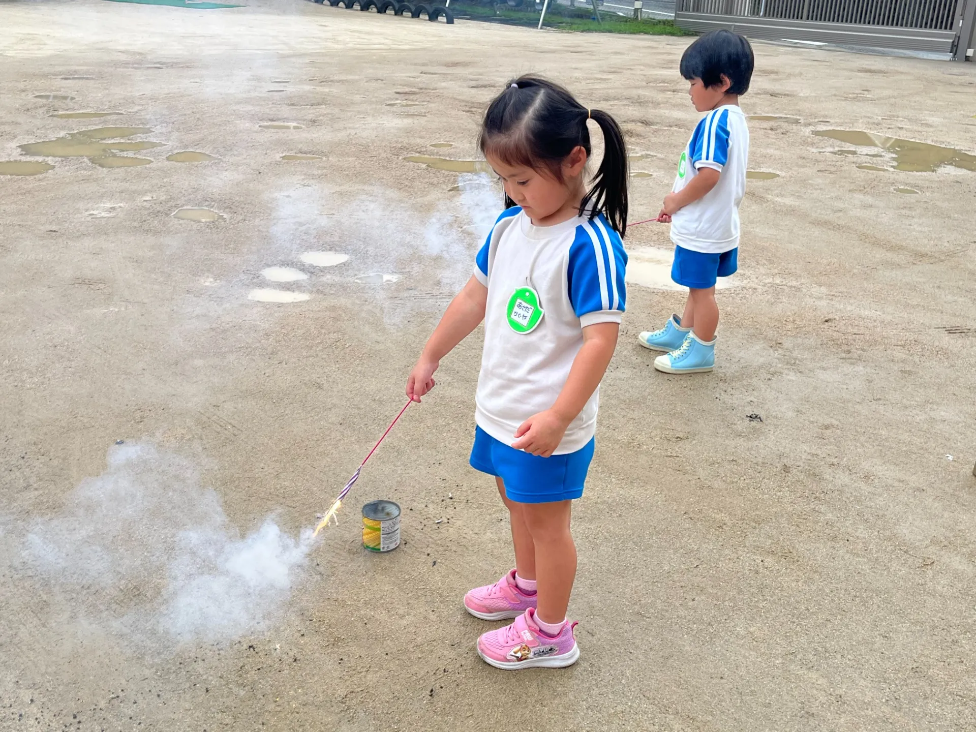 24日花火教室がありました🎵消防署の方から花火をする時のお約束のお話しがあり、そのあとに実際に花火をしました✨「きれーい」「初めてした‼」ととっても嬉しそうな子。一人で花火を持ちちょっぴり緊張気味な子。とそれぞれでしたが、貴重な体験をさせていただきみんな楽しめたようです😊花火の後は消防に関する○×クイズや火を消す方法を教えて頂き、またひとつかしこくなったB組さんです☆