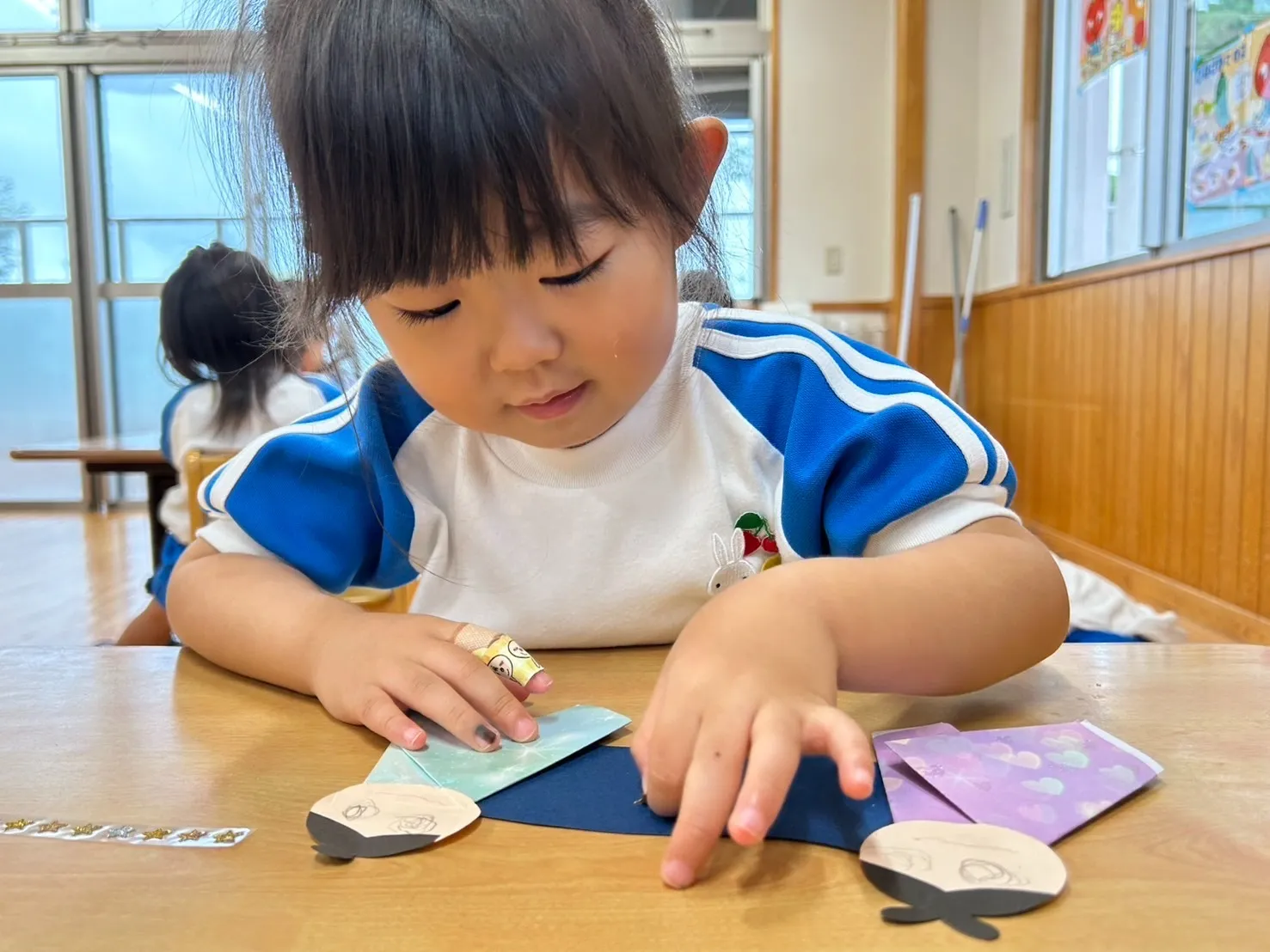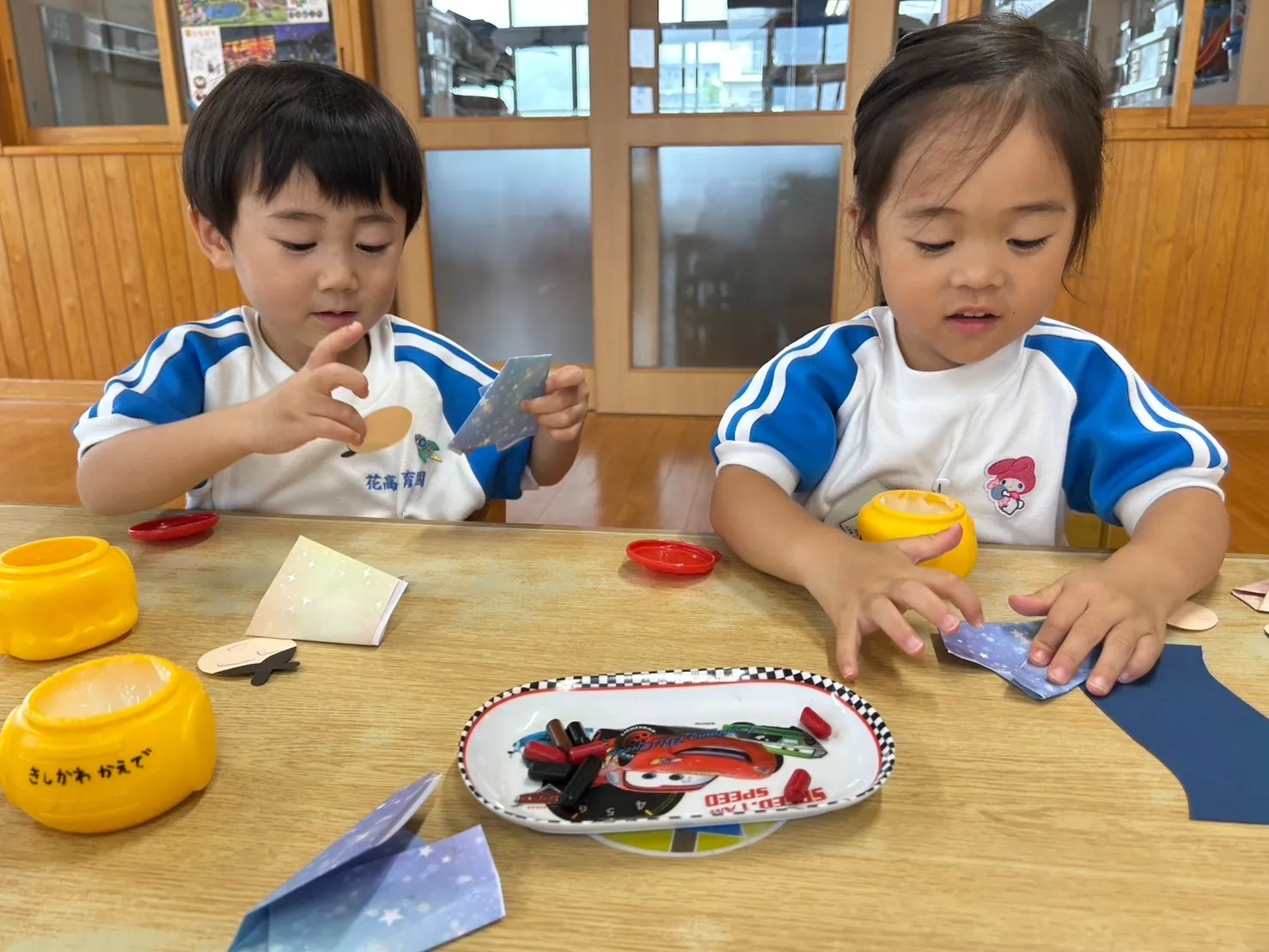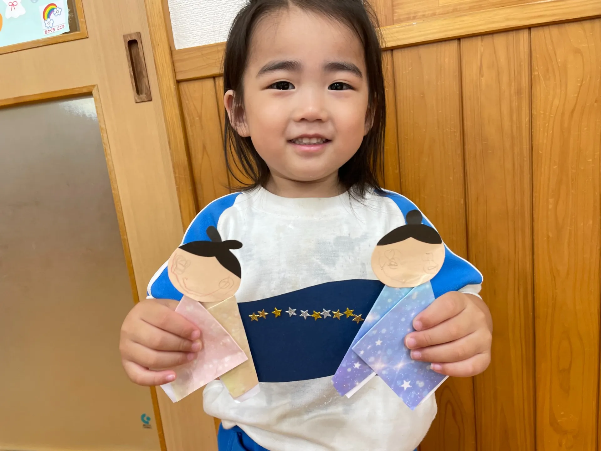 クーピーで顔を描き、折り紙で服を折り、糊付けやシール貼りなど色々な作業がありましたが一つひとつ説明をよく聞いて集中して取り組む姿が見られました✨出来上がったかわいい織姫と彦星を笹に飾るのを楽しみにしている子どもたちです😊