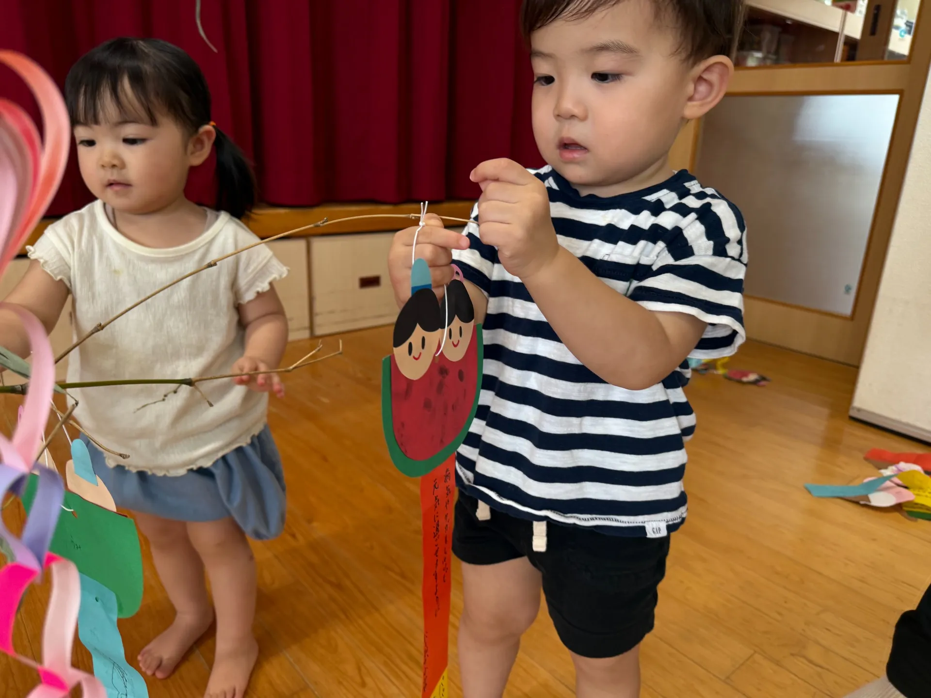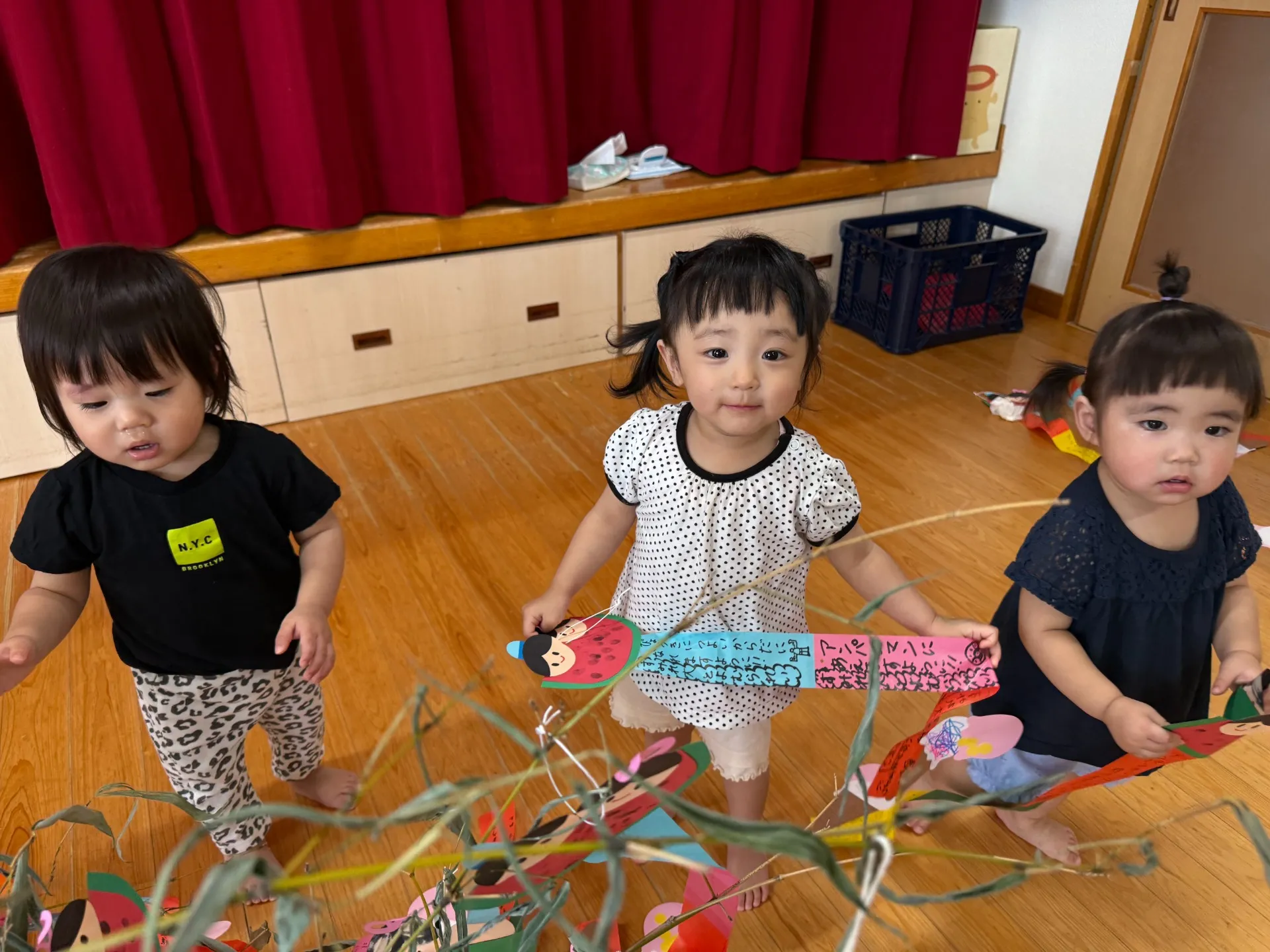 大きな笹の葉に驚いていた子どもたち!!「おおきいね~」という声も聞こえてきましたよ😊❤願い事を書いた短冊を嬉しそうに手に取り、飾りつけを楽しんでいましたよ♬