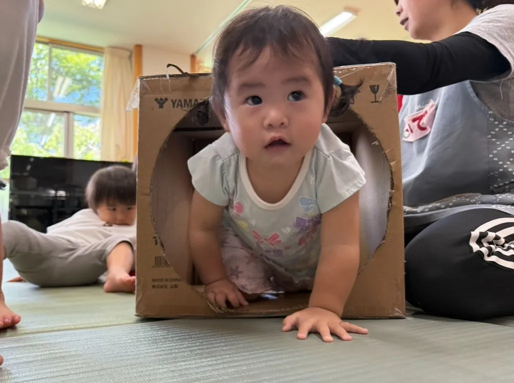 ブロックで乗り物を作ったり、段ボールのトンネルをくぐってみたりとお部屋でも元気いっぱいの子どもたちです🎵「わんわん」と犬のマネをしてくぐっている可愛らしい姿も見られました❤