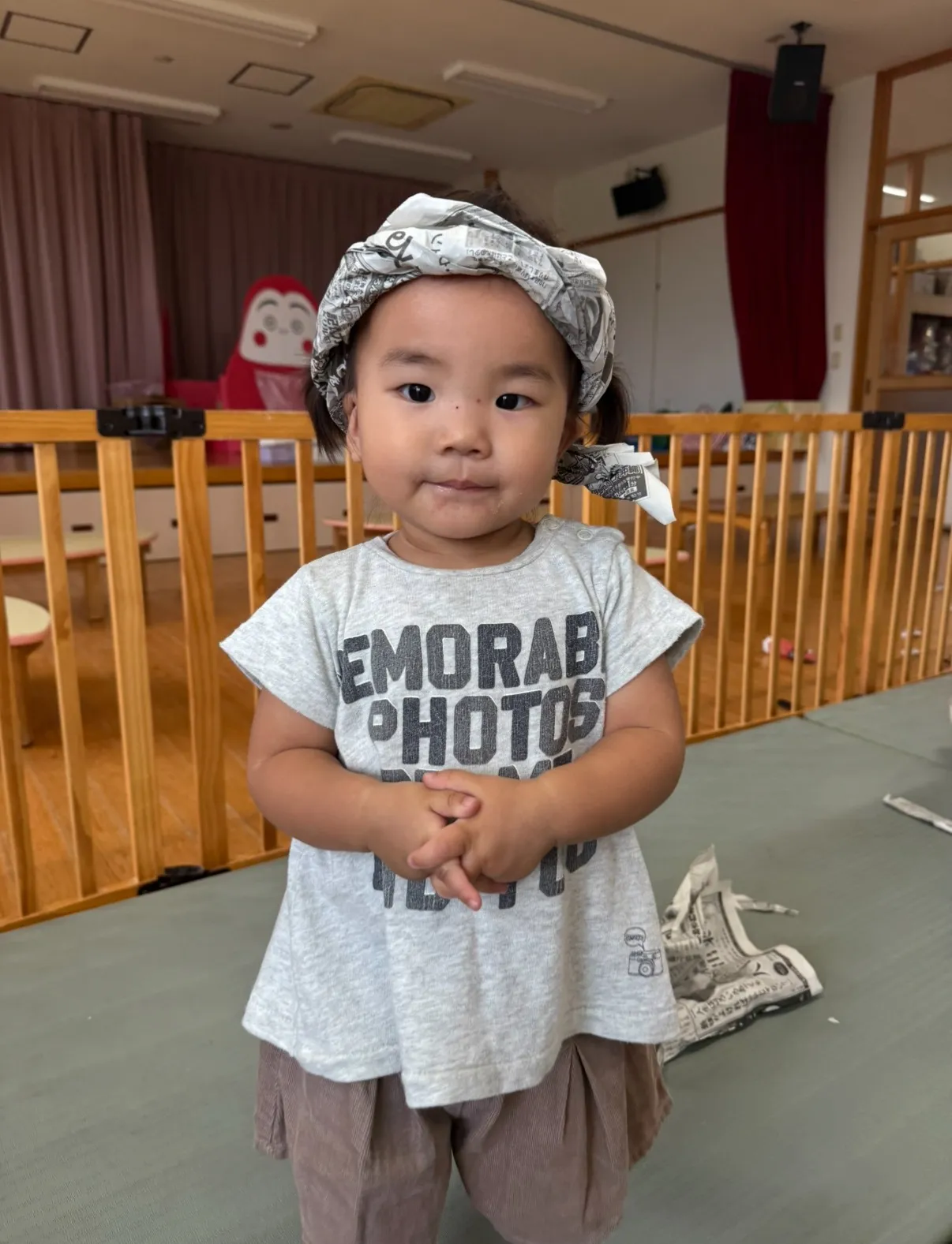 新聞紙遊びの時にはハチマキを頭に付け、夏を満喫している子どもたちでした🌞