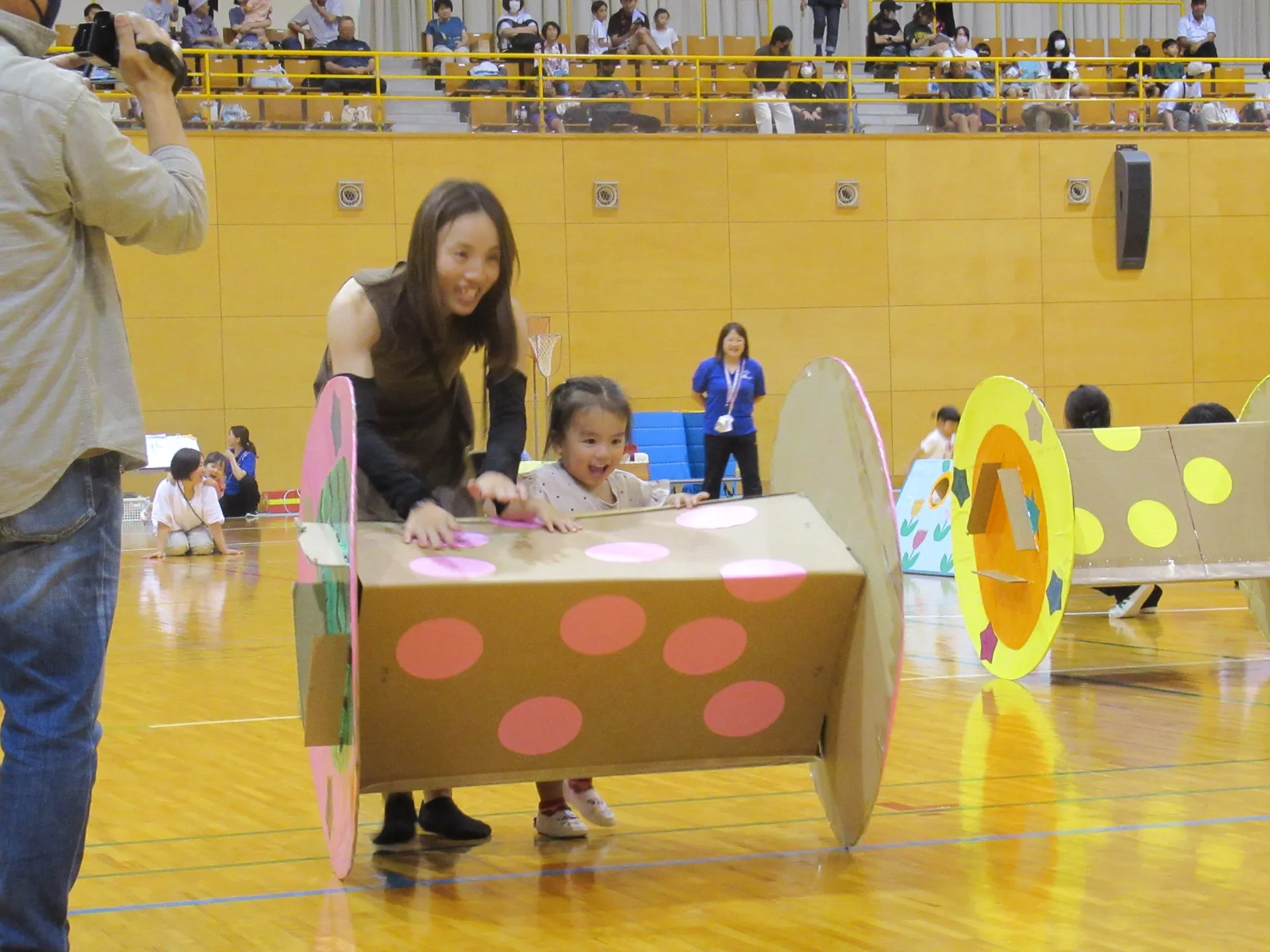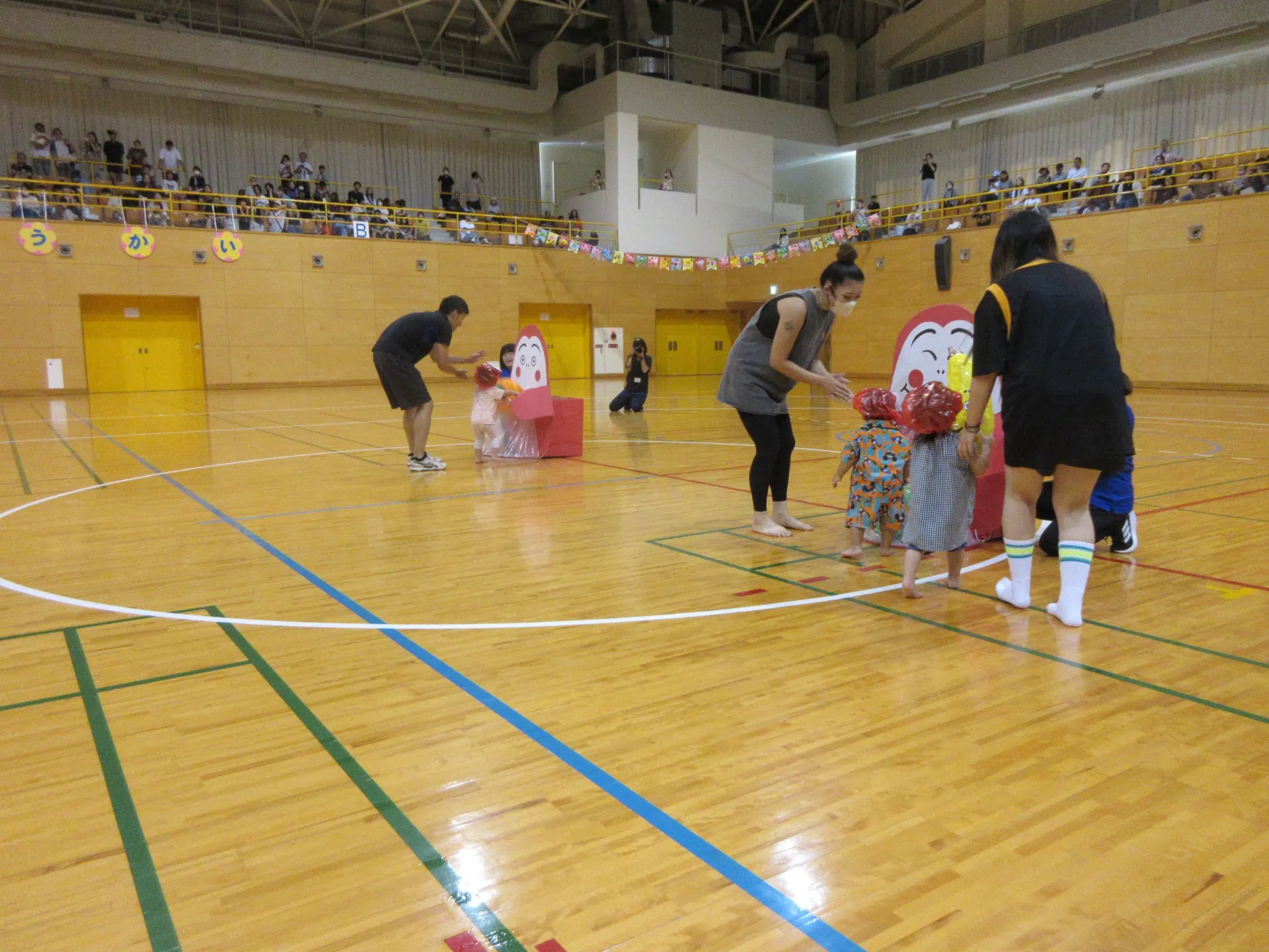 8月4日(金)に親子運動会が東部スポーツ体育館で行われました。広くて新しい場所で楽しんでお家の方と参加しました。すみれ小組の親子競技「うみのおさんぽ」では、潜水艦に乗って出発です。お気に入りのお魚をゲット🐠してゴールです✨✨すみれ大組の親子競技では、かわいいだるまさんにんなっての登場!!好きな果物🍓を「だるまさんにはいどうぞ!」できたかな??ゆり組はトンネルをくぐり大きいものまで転がして「はねをパタパタ!ちょうちょに大変身」することができていました🦋