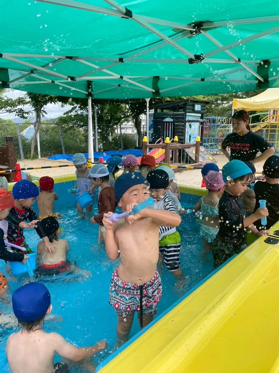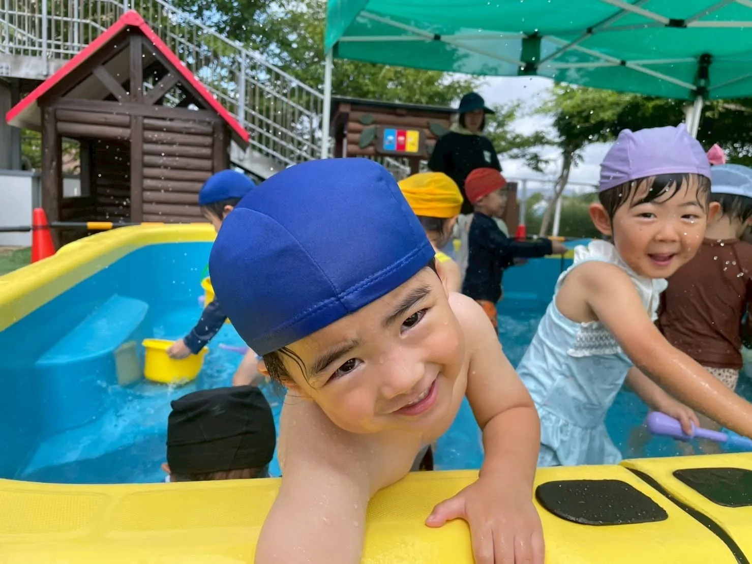 園庭に大きなプールが設置され、ばら組さんははじめてのプール遊びをしました✨✨みんなすごくステキな笑顔ですよね😆プール遊びの感想を尋ねると、みんなが「楽しかった!」と言っていました🌟「またする?」「いつ?明日?」と次回をワクワクして待っている様子でした😊