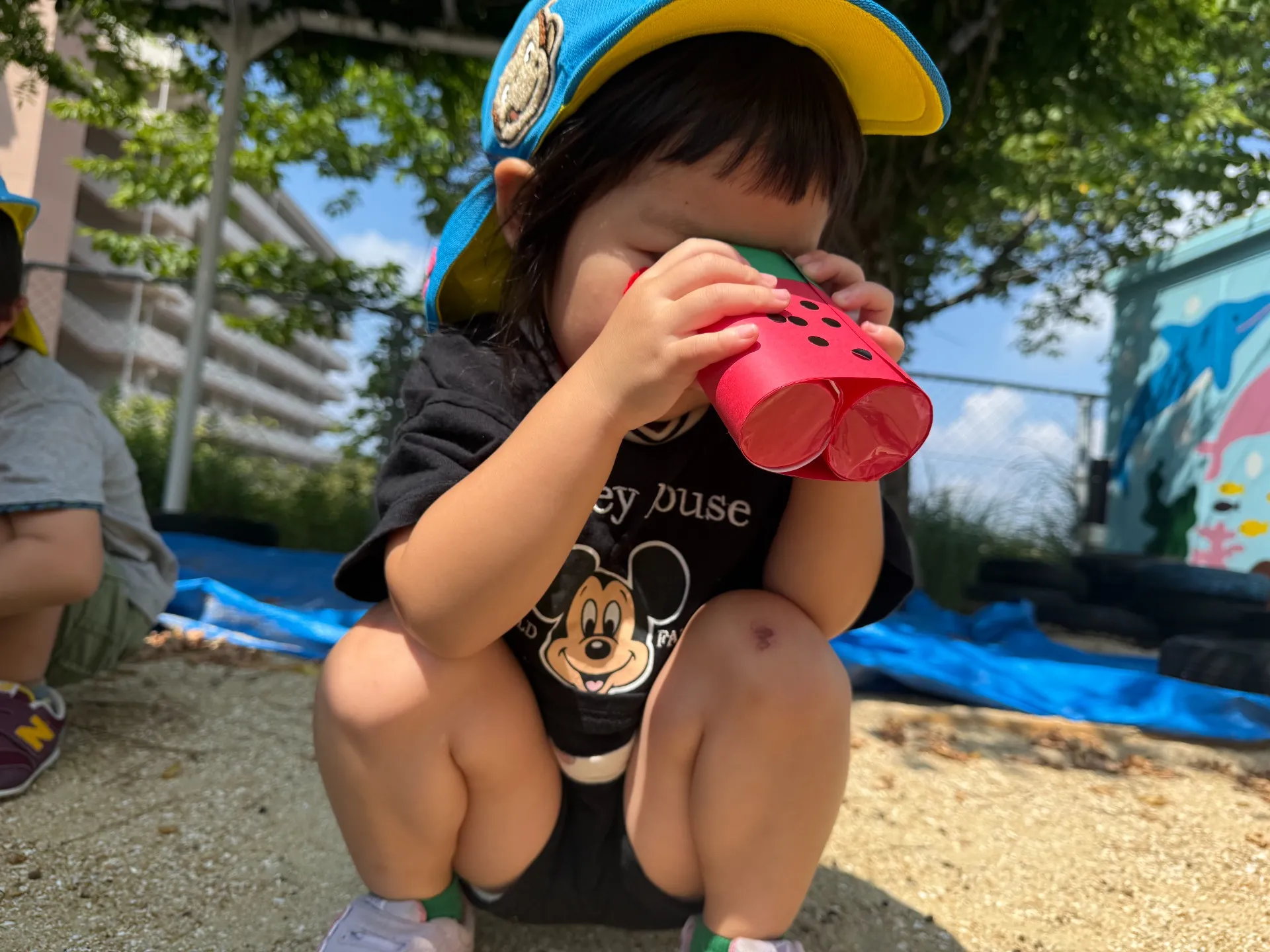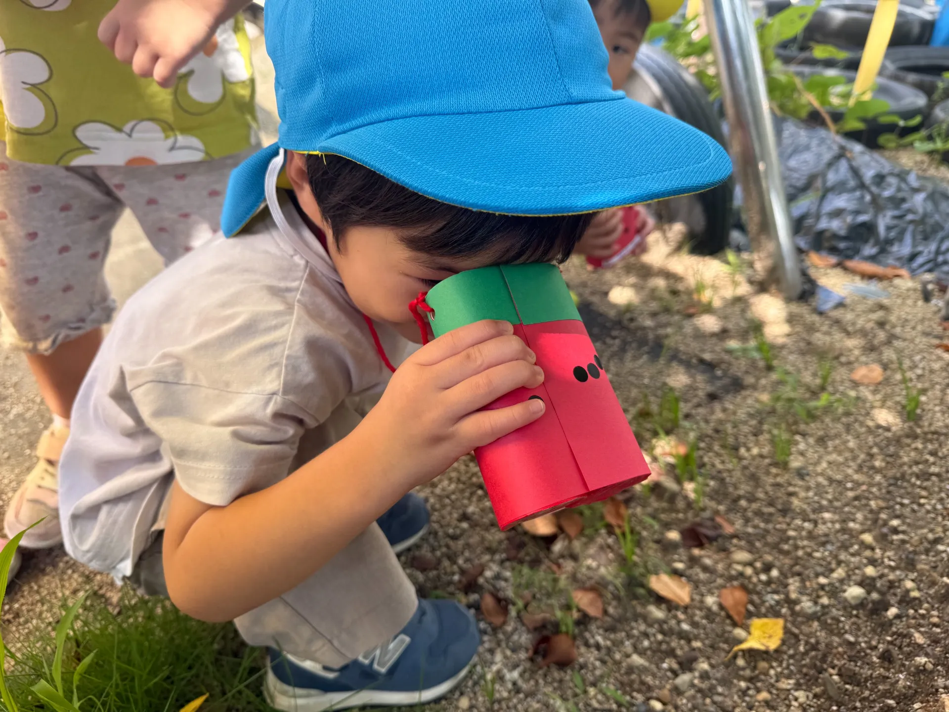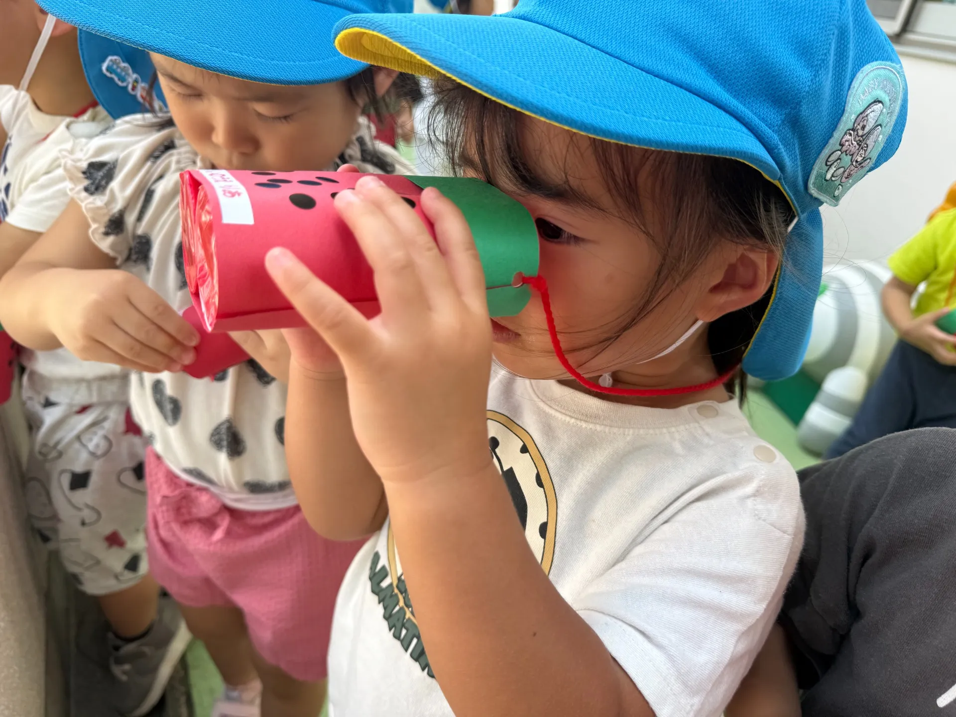 スイカの双眼鏡を作って園庭へ散歩に行きました🚌双眼鏡を使ってアリさんやセミさん、アサガオ、工事現場のクレーン車など色々な所を回って見る事が出来ました❤先生が「虫いたよ~」と言うとみんな駆け寄ってすぐに双眼鏡でのぞいてました✨普段虫を怖がる子でも双眼鏡を使い、じっくり観察する事ができていました‼久しぶりの園庭へのお散歩とても楽しんでいましたよ![]()