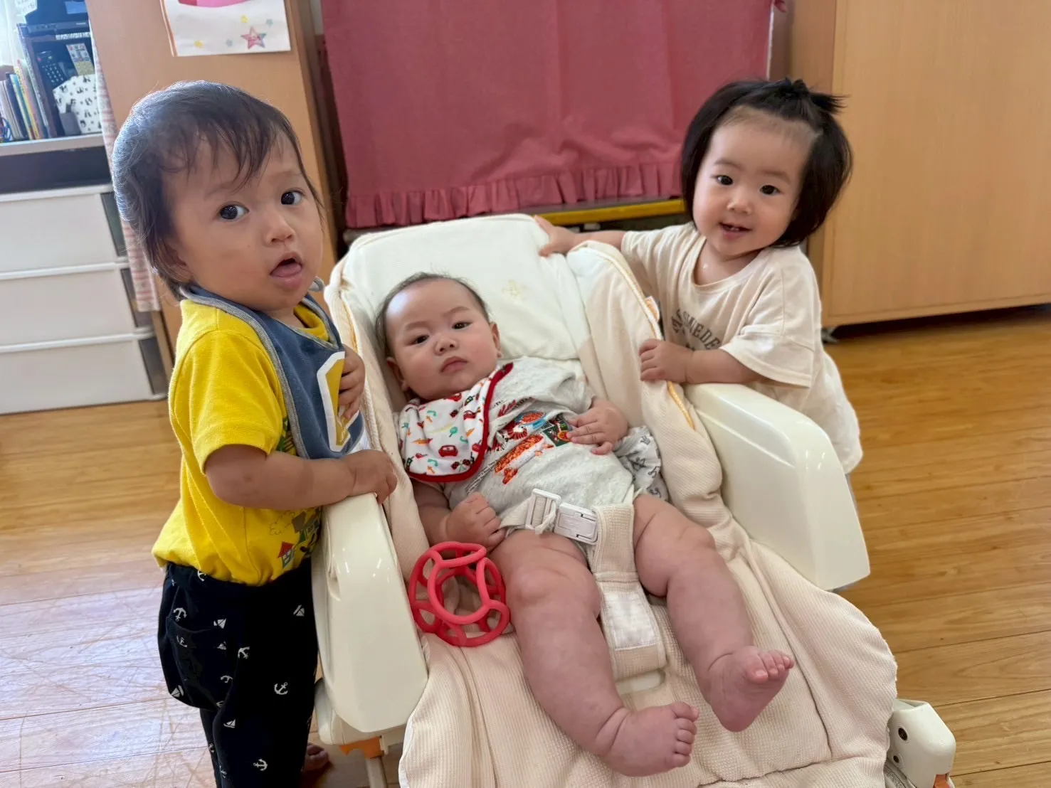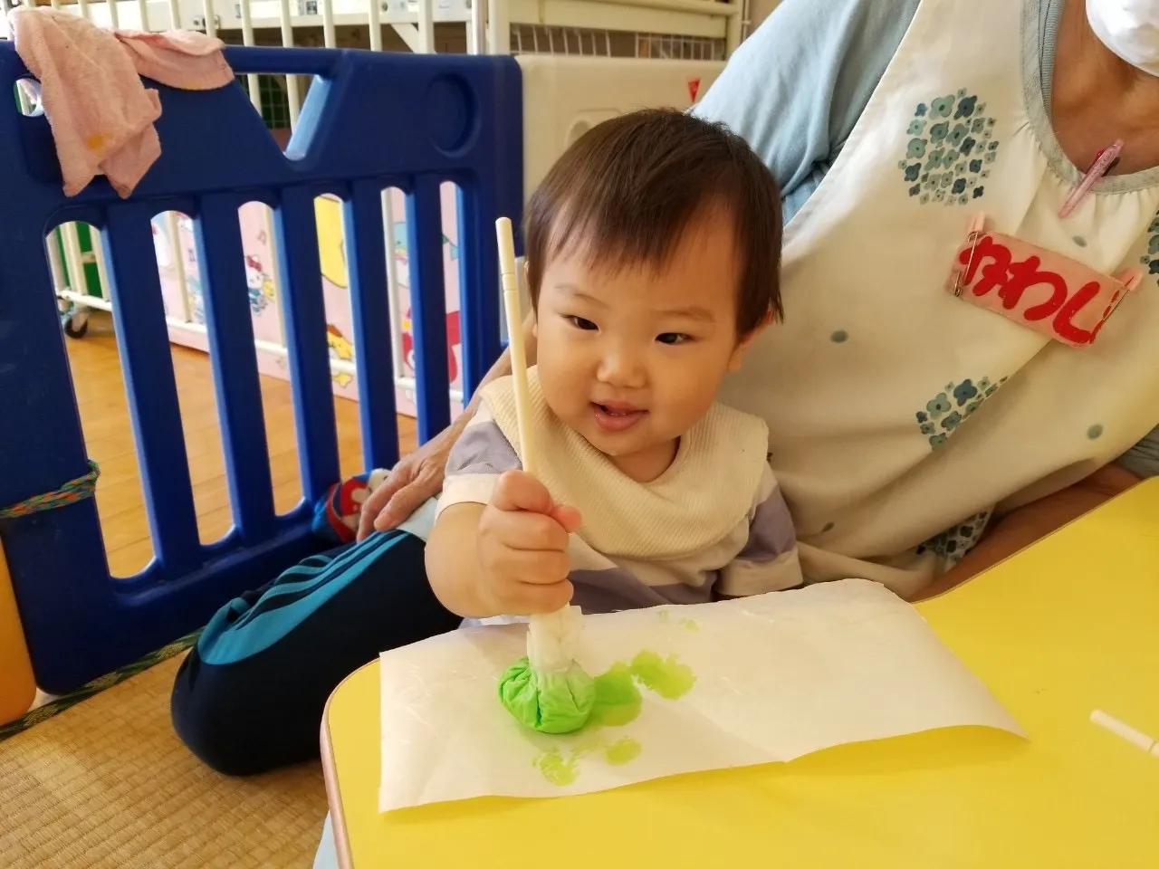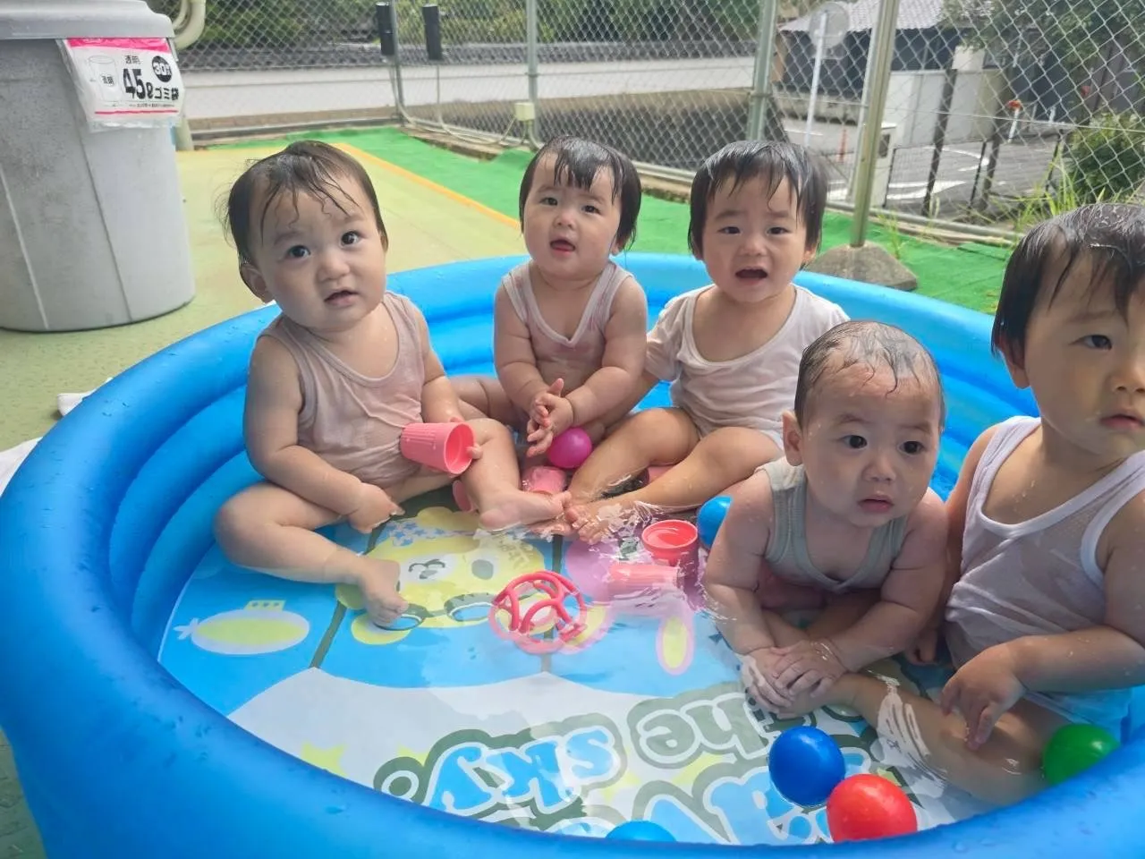 お疲れ様です。お盆のお休み明けもみんな元気に登園してきています☆ お休み中のケガや病気もなく、ひと安心しています。残暑が厳しい中、子どもたちはじっとすることなく動き回ったり、友だちと同じことをして、関わりながら笑い合って遊んでいます。水遊びをしたり、ポンポンでスタンプをしたり、言葉の理解や集中できることも増えてきています。毎日にぎやかに過ごしているすみれ組さんです。