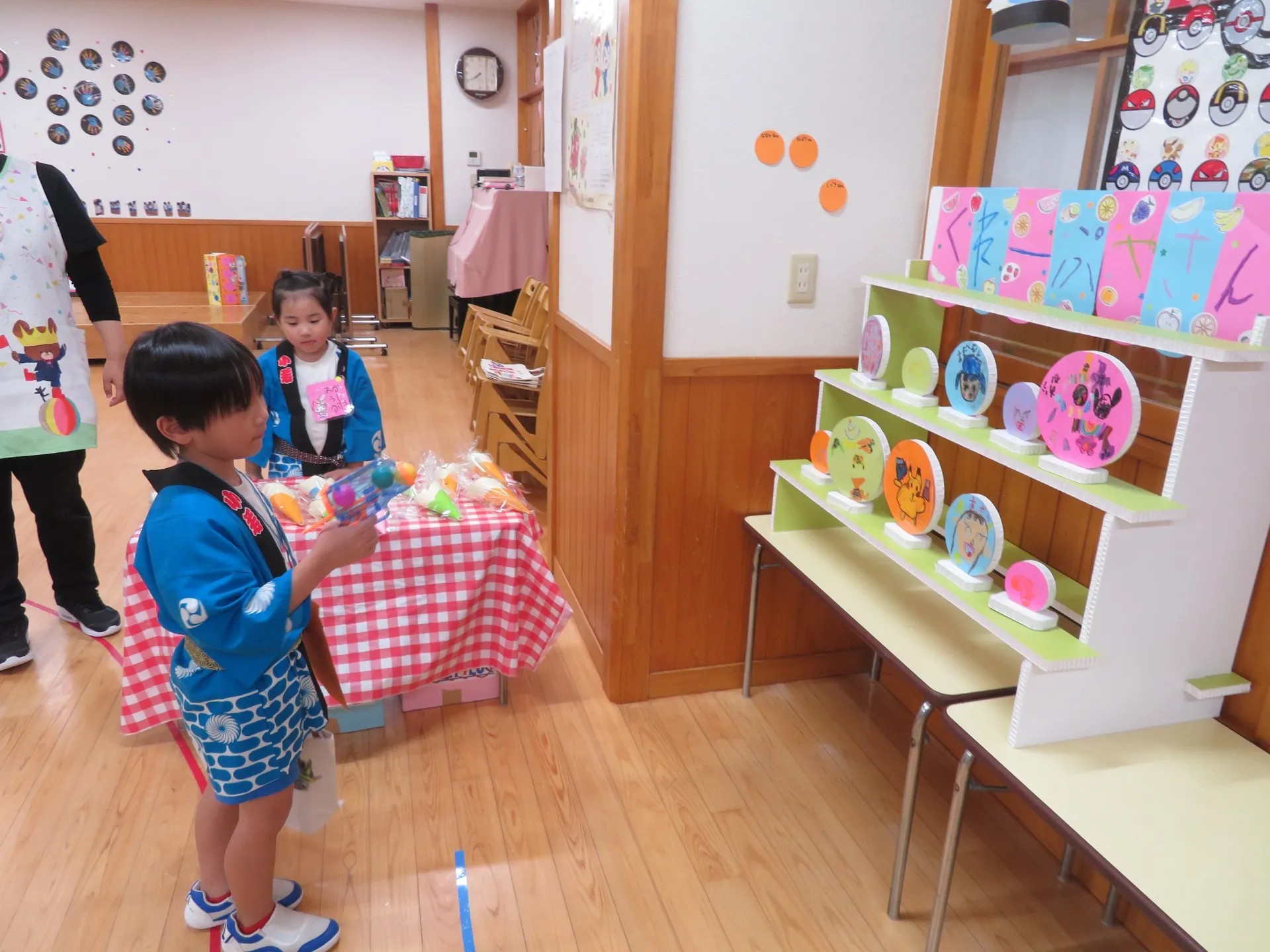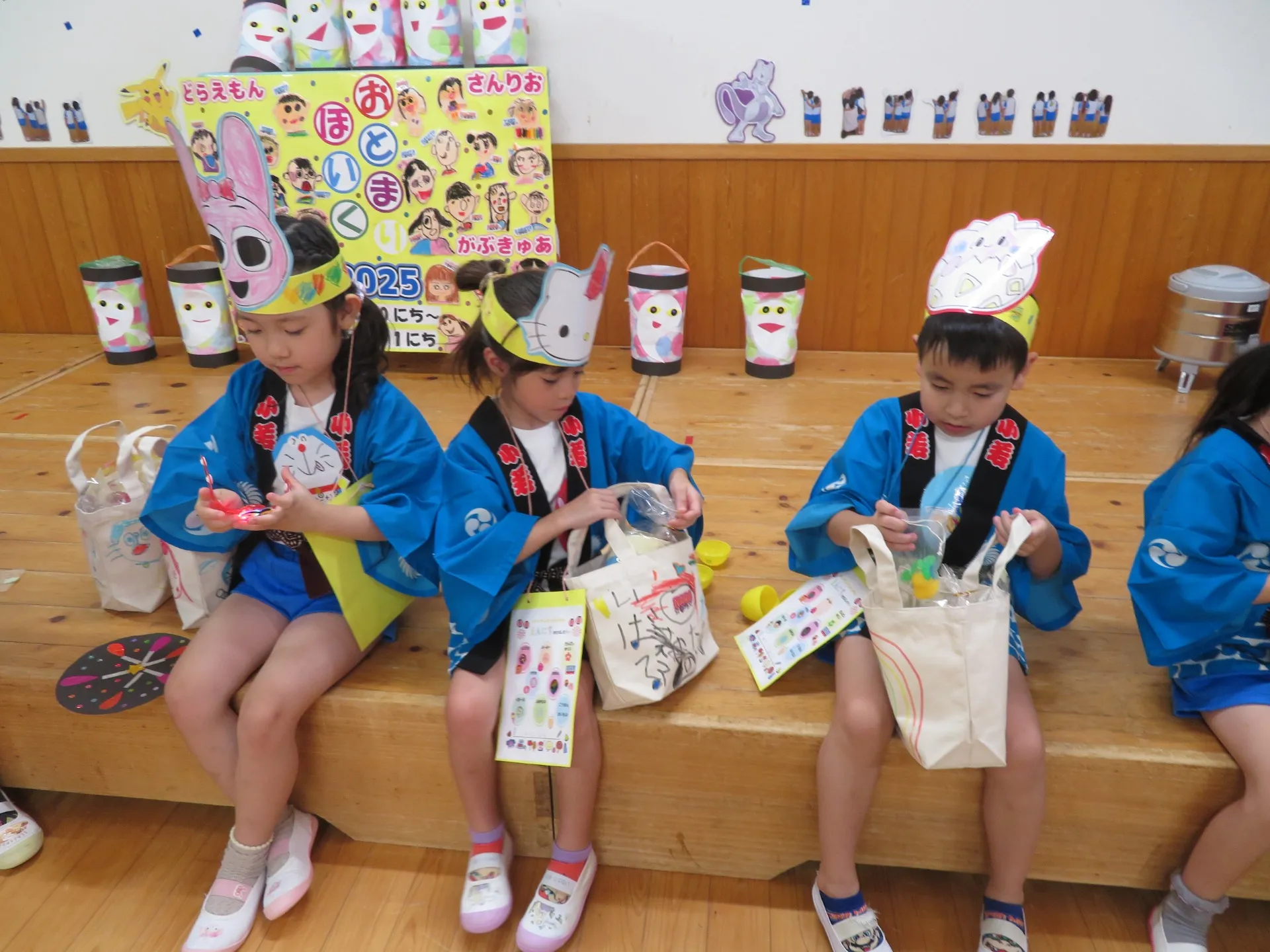 みんなが楽しみにしていた、縁日🏮がありました❗うちわ屋さん、飲み物屋さん、おめん屋さん、クレープ屋さん、くじびき、金魚すくい、ヨーヨーつりがあり、どれも、興味津々でした😄1番人気は、くじびきでした♪たくさんのおみやげができて大喜びでしたよ❤盆踊りでは「もったいないばあさん」を楽しく踊っています🧡おみやげ話しがたくさんだと思います💛