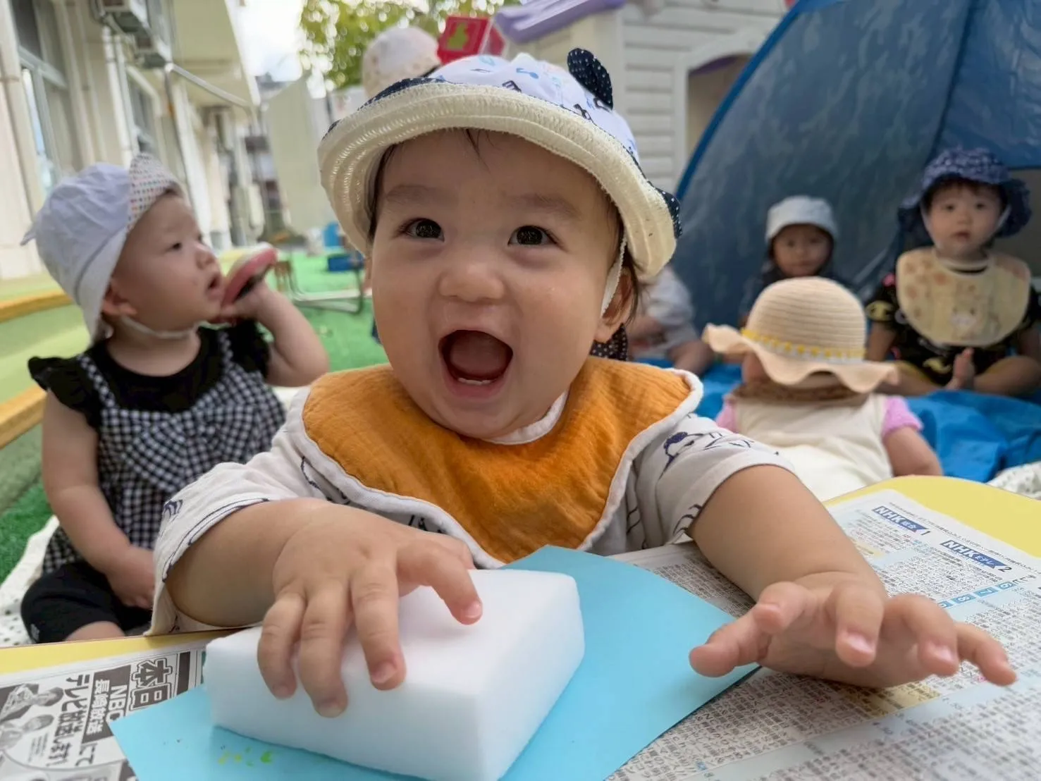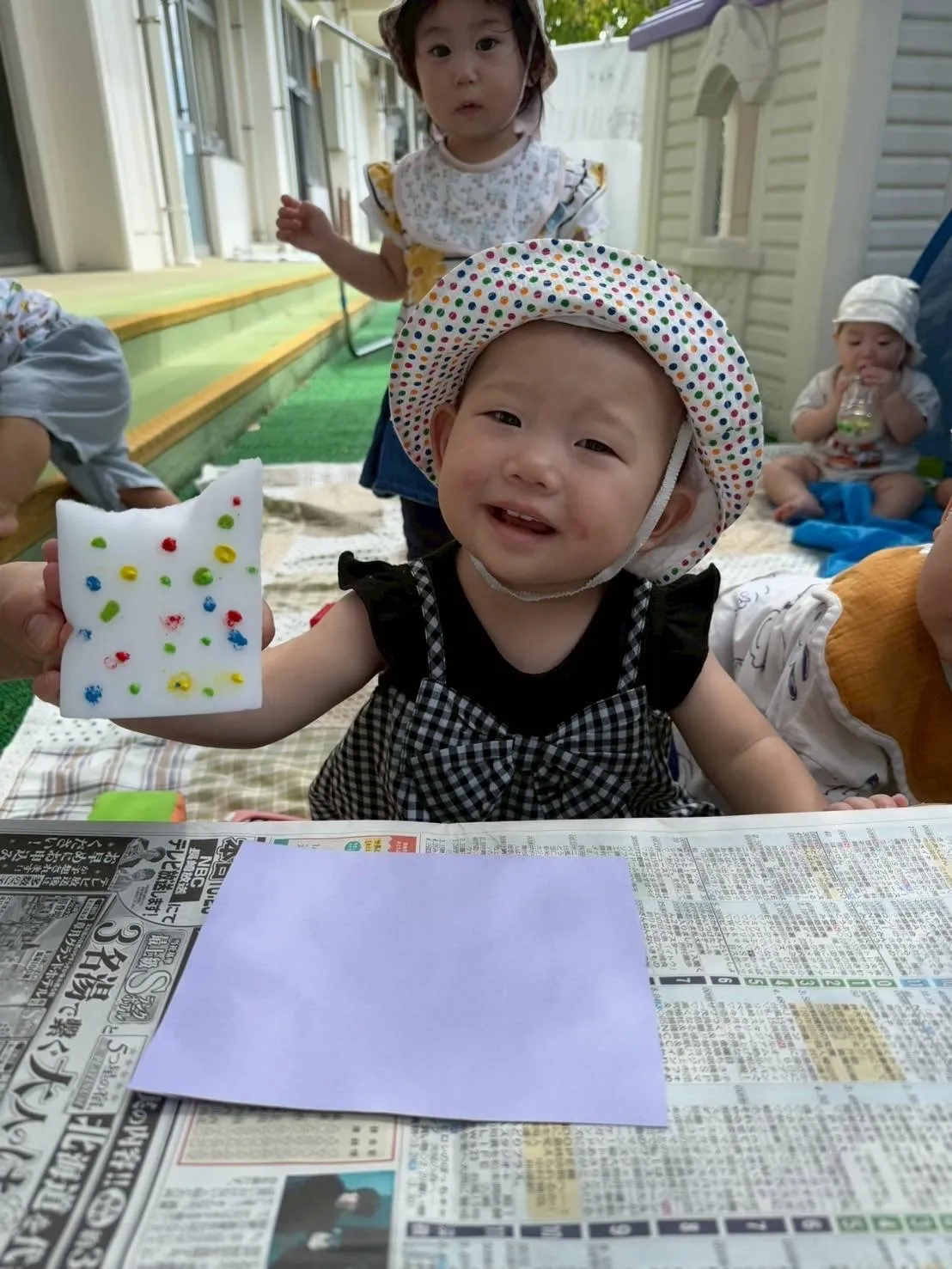 🌤夏の暑い日差しがほんの少し落ちついて来ましたネ✨今年度、最後のプール遊びを5日(金)に終えてから、芸術の秋に突入という事でスタンプ製作をテラスに出てしてみました。いつもと場所が変わるとウキウキ度も増して、皆スタンプを押す手も早くサクサクっと楽しく終了しました。出来上がりはこの後のお楽しみに・・・😊製作後は日よけシェードの下に簡易テントを設け玩具遊びをしばらくの間楽しみお部屋に帰りシャワータイムで終了しました✨✨