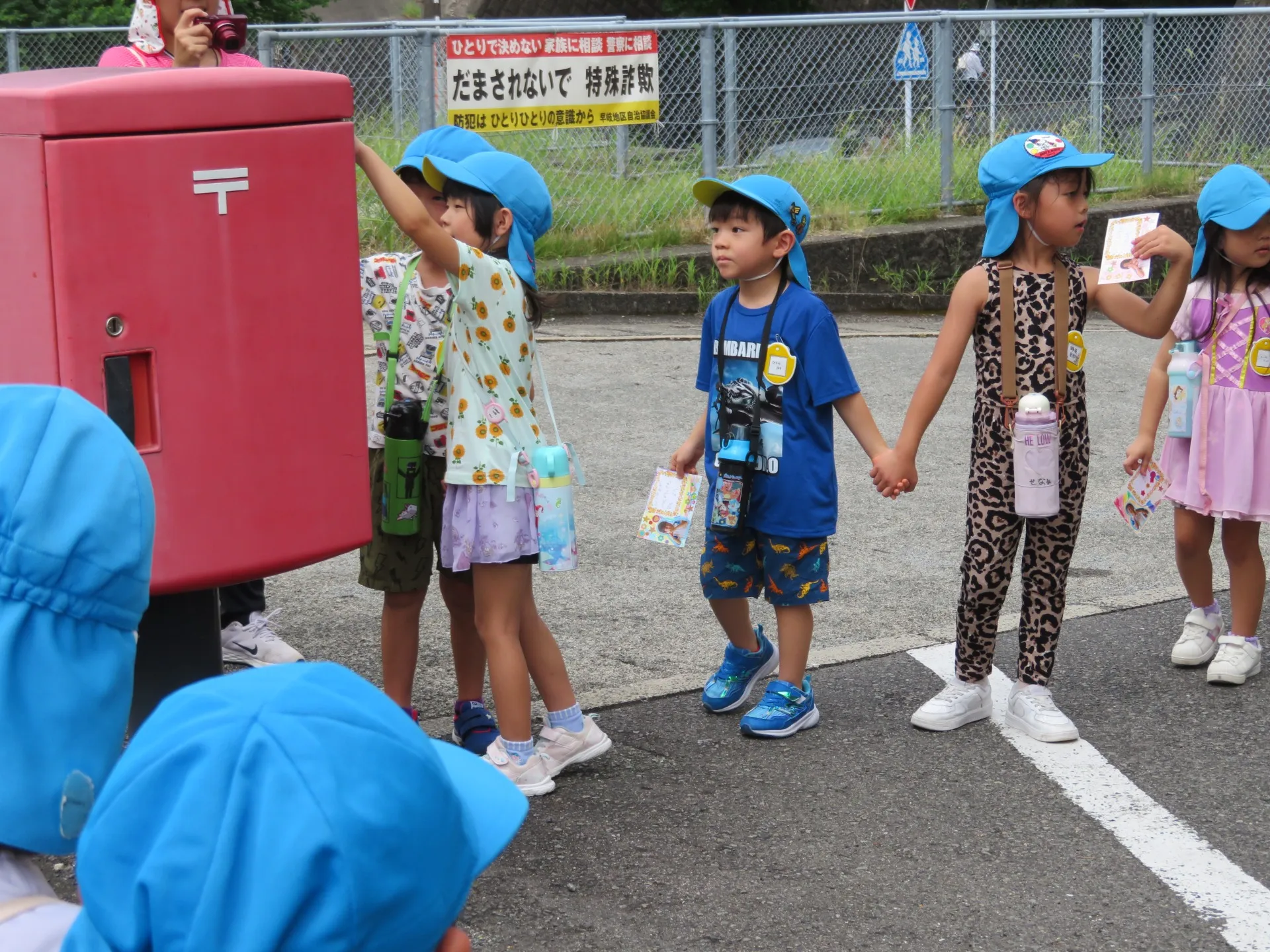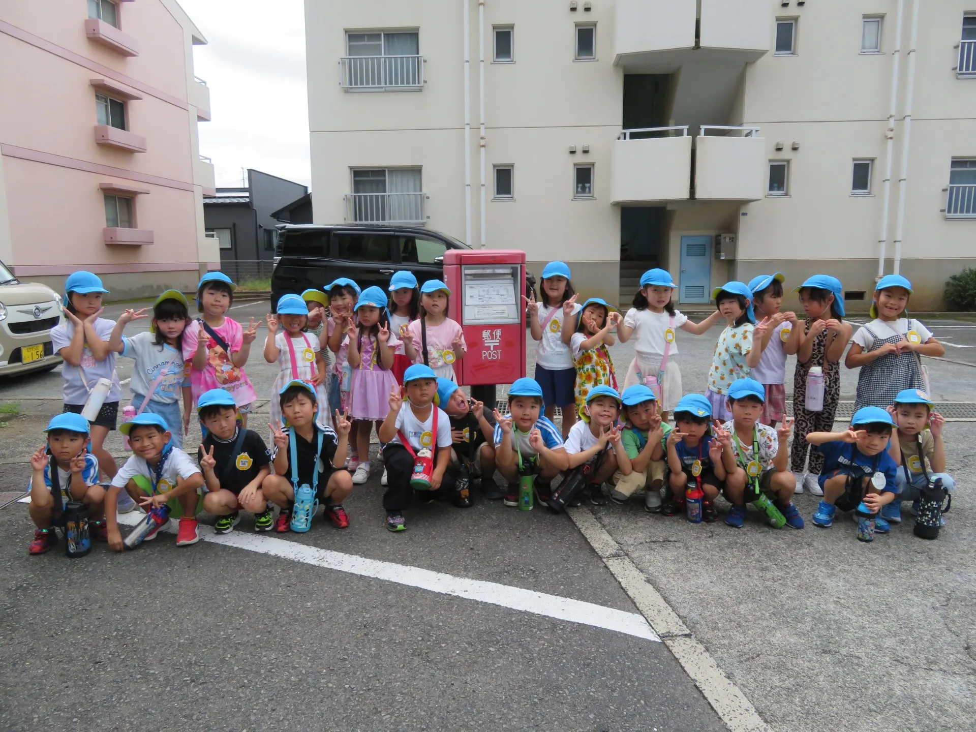 自分が書いたハガキをしっかりと手に持ってニコニコで歩くA組さん😊