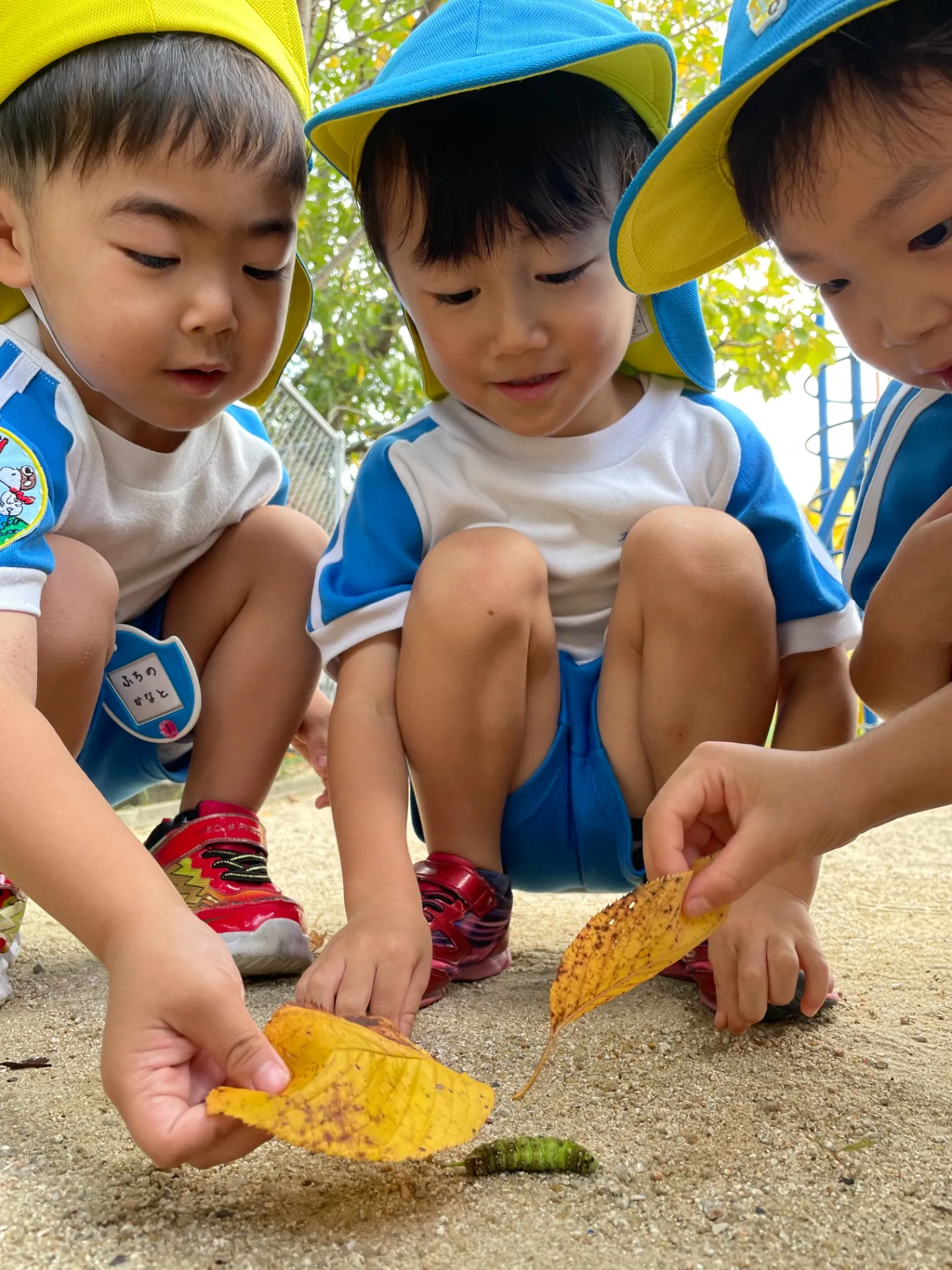 そんな園庭でたくさんの秋を見つけました!茶色、黄色、オレンジ色と様々な色の落ち葉🍂をいっぱい集めたり、イモムシ🐛を見つけると葉っぱで優しくなでながら「どこからきたのー?」と話しかけたりしている姿が見られましたよ😊