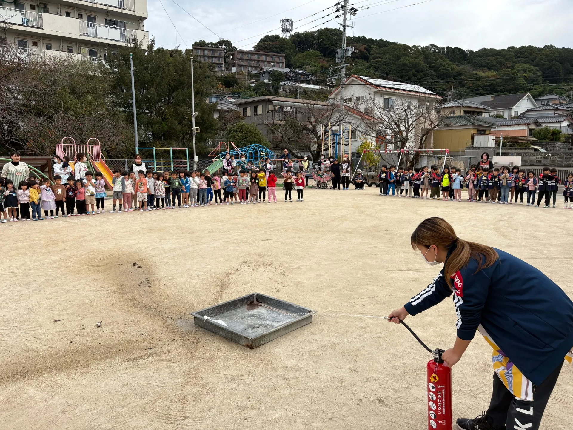 11月13日(木)に避難訓練・消火訓練を行いました。非常ベルが鳴るとすぐに避難することが出来ていた子ども達。A組さんやB組さんは煙を吸わないようにハンカチや手で口を押さえて避難する様子が見られました。消火訓練では実際に燃え上がる火を見て少し怖がる様子が見られましたが、無事消火すると安心して終わることができましたよ。