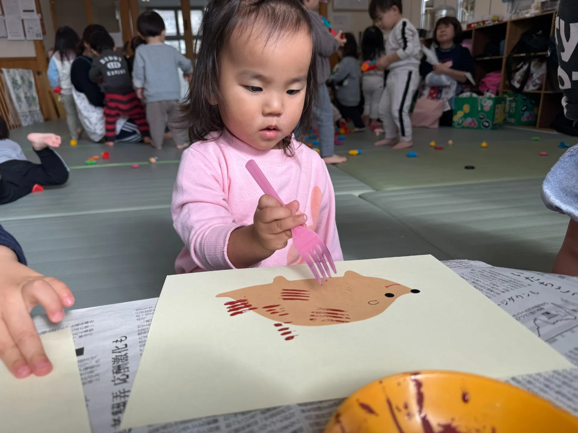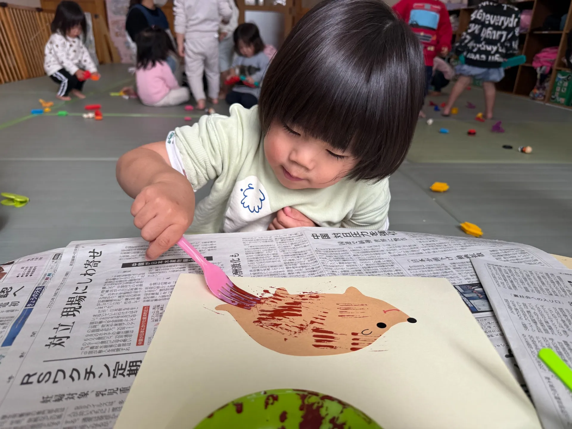 フォークを使って絵の具をスタンプしトゲトゲ模様をつけました!絵の具がついているかな~と確認しながら製作を楽しんでいました♪作ったものを見て「できた~!かわいい~」と言っているお友だちもいましたよ😊