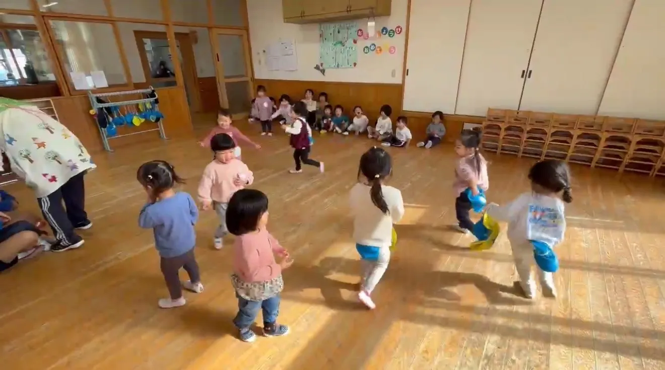 椅子取りゲームとしっぽ取りゲームをしました♪初めはしっぽを取られのが少し怖かったり、恥ずかしかったりして参加をためらう姿も見られましたが、友達が楽しそうに走る様子を見たりしているうちに楽しんで参加している姿が増えてきました