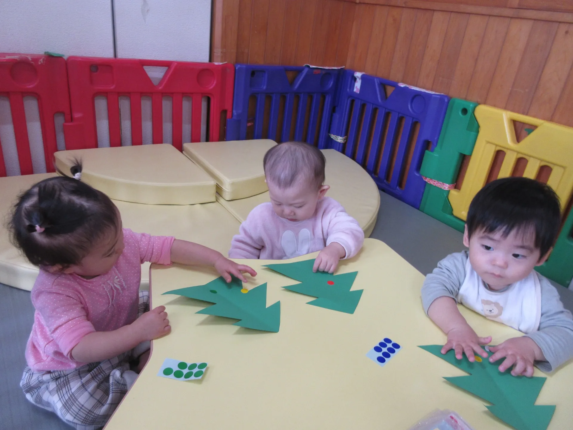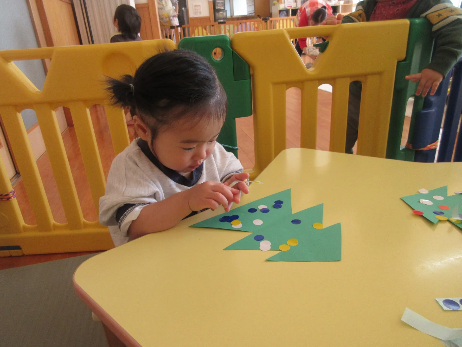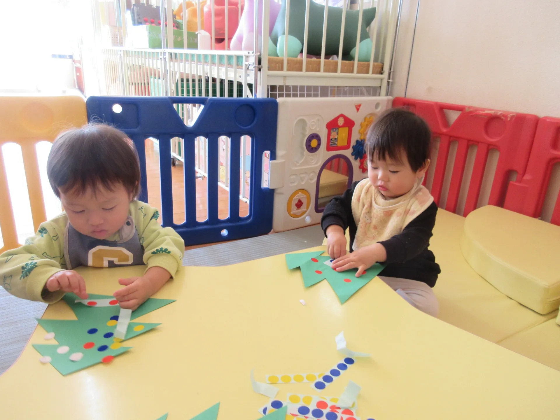 🎄クリスマス製作でシール貼りをしました✨四月初めに比べ、手指の発達が著しく一人でシールを手の指にのせ、ツリーの台紙に手早く貼る姿を見て驚きました😲最初から最後まで一人で貼る事ができ、あまりのはやさにあっという間にシールがなくなってしまいました💦手を広げてシール頂戴のポーズも可愛いかったです✨クリスマスにサンタさんが来てくれるといいですね💞