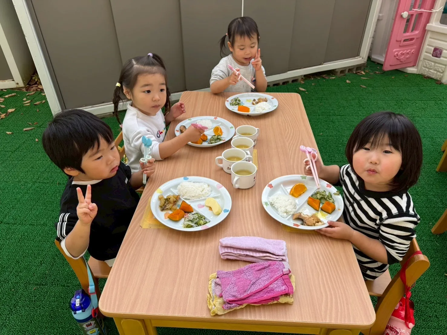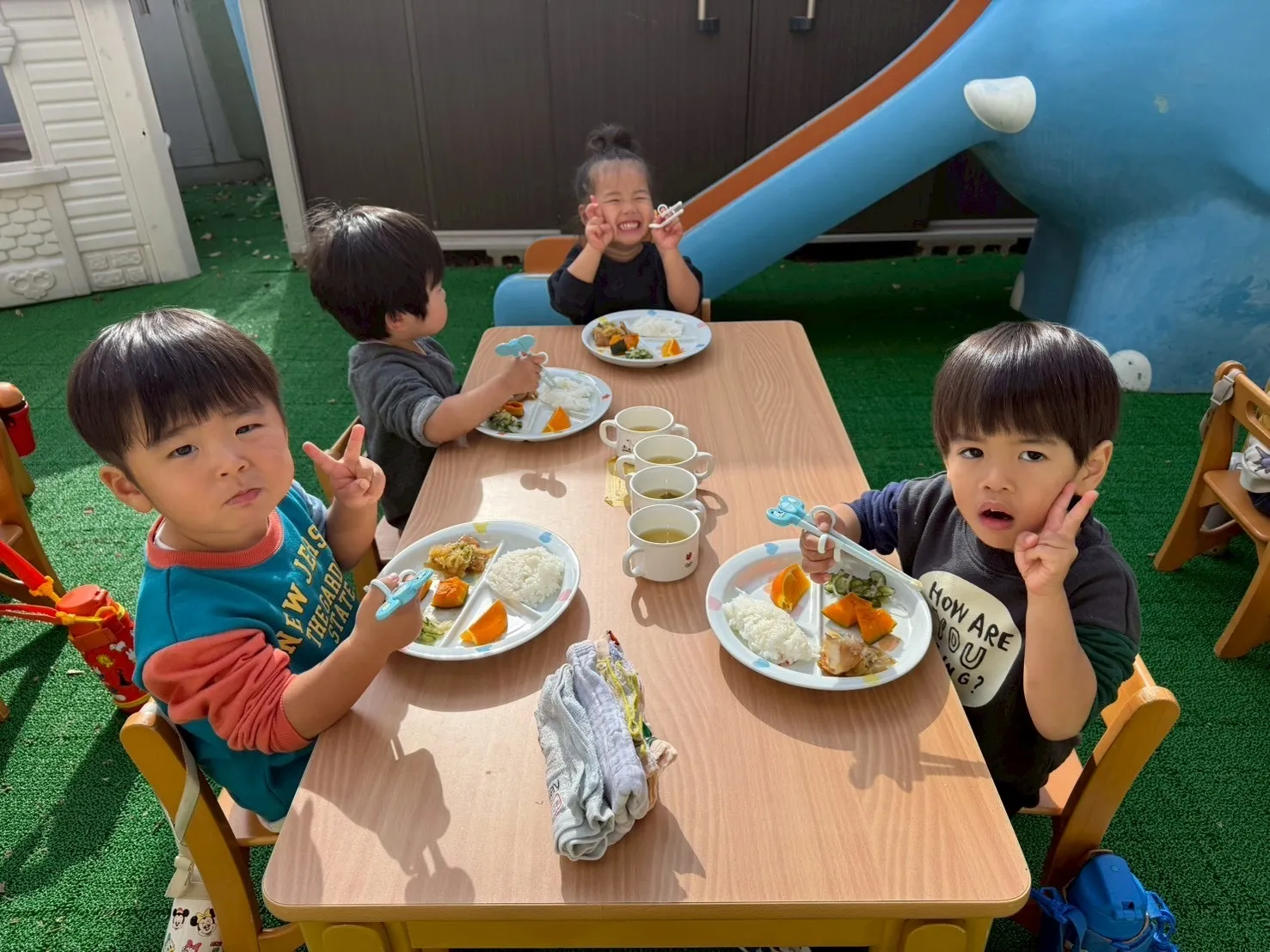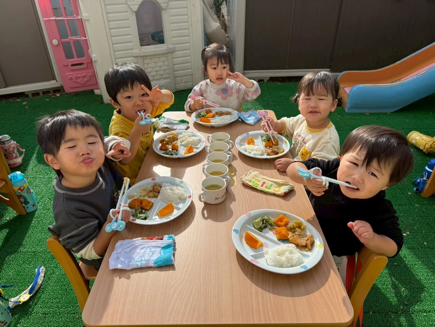 お外で食べる給食はいつもと違ってさらにおいしかったようで、食べるスピードもいつもより早かった子ども達でした♪