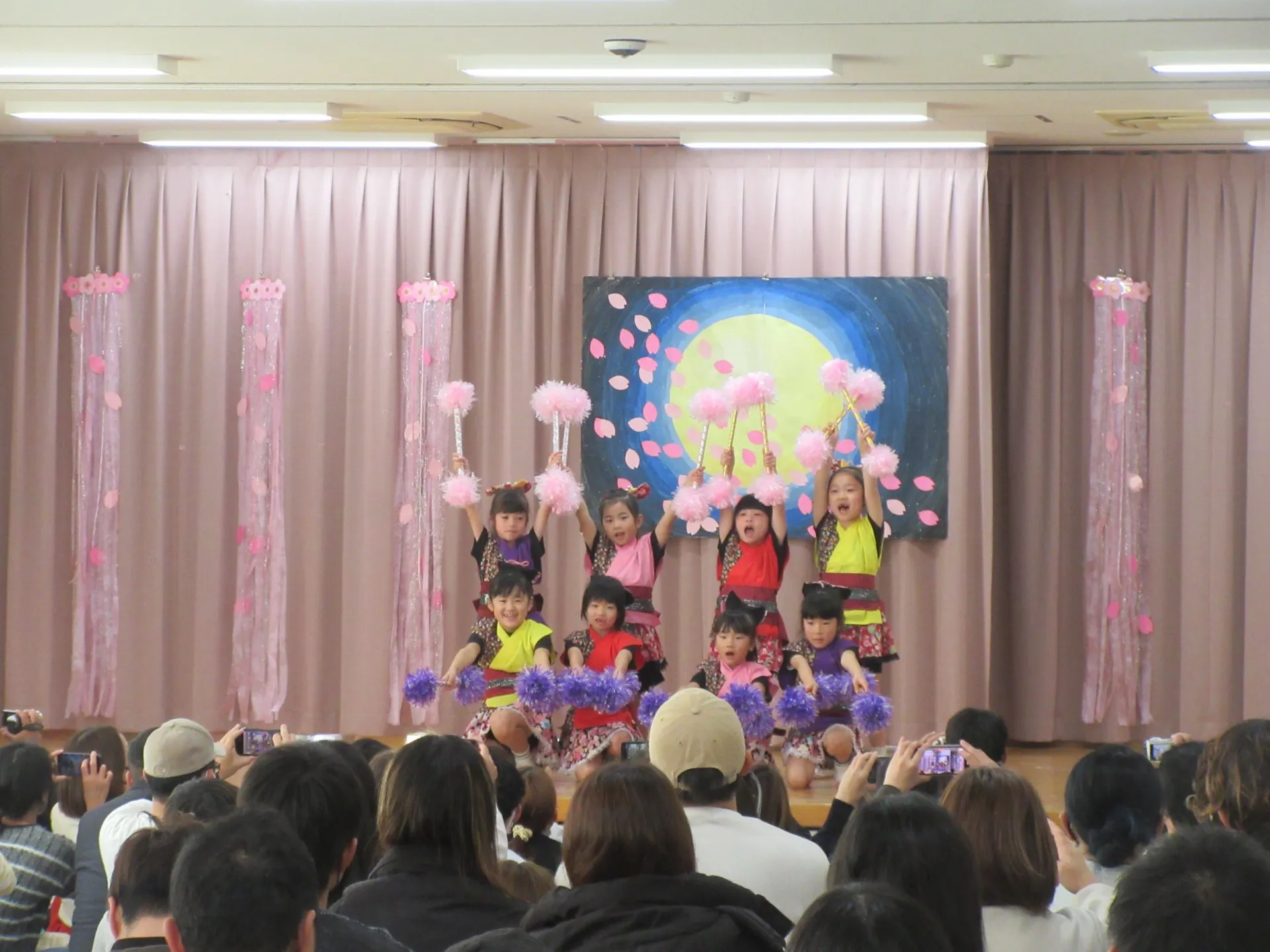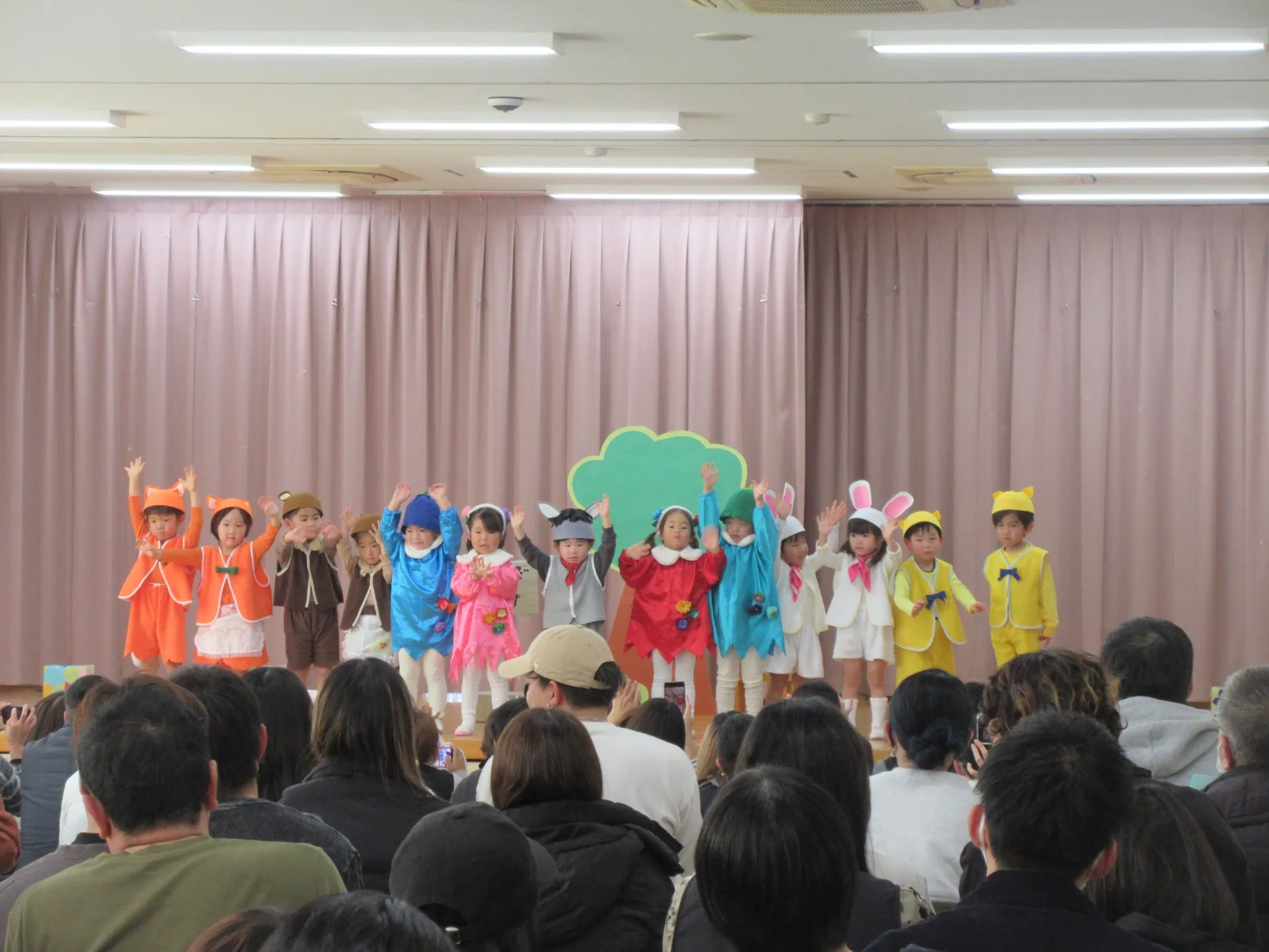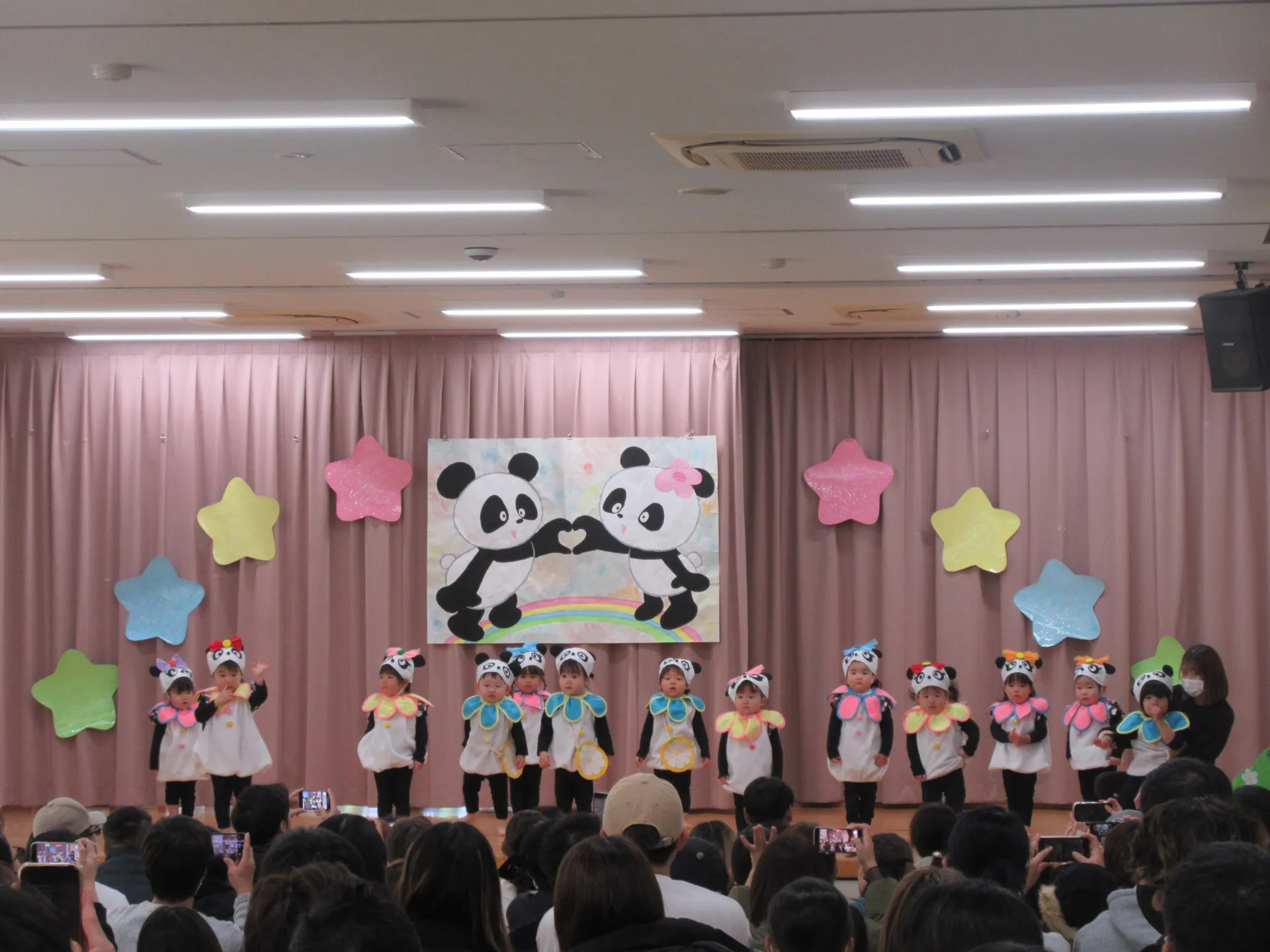 お遊戯会2部では桜A組、ばら組、すみれ大きい組さんでした。てんとう虫さんやパンダになったすみれ大きい組さんはちょっぴり緊張しましたが、可愛いお遊戯を披露してくれました。ばら組さんはお家の人に見てもらってとっても嬉しそうでした。舞台の幕越しに「ママ」と話しかける場面もありましたよ。桜A組さんは年長らしく立派に表現できていました。最後の「いのちのうた」の時はちょっぴり胸が熱くなりました。大きな成長を見せてくれましたね。