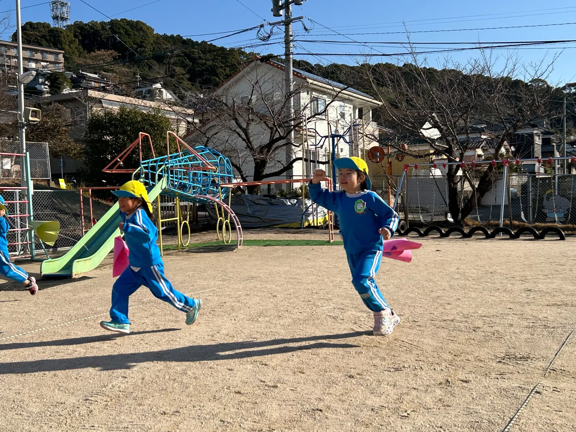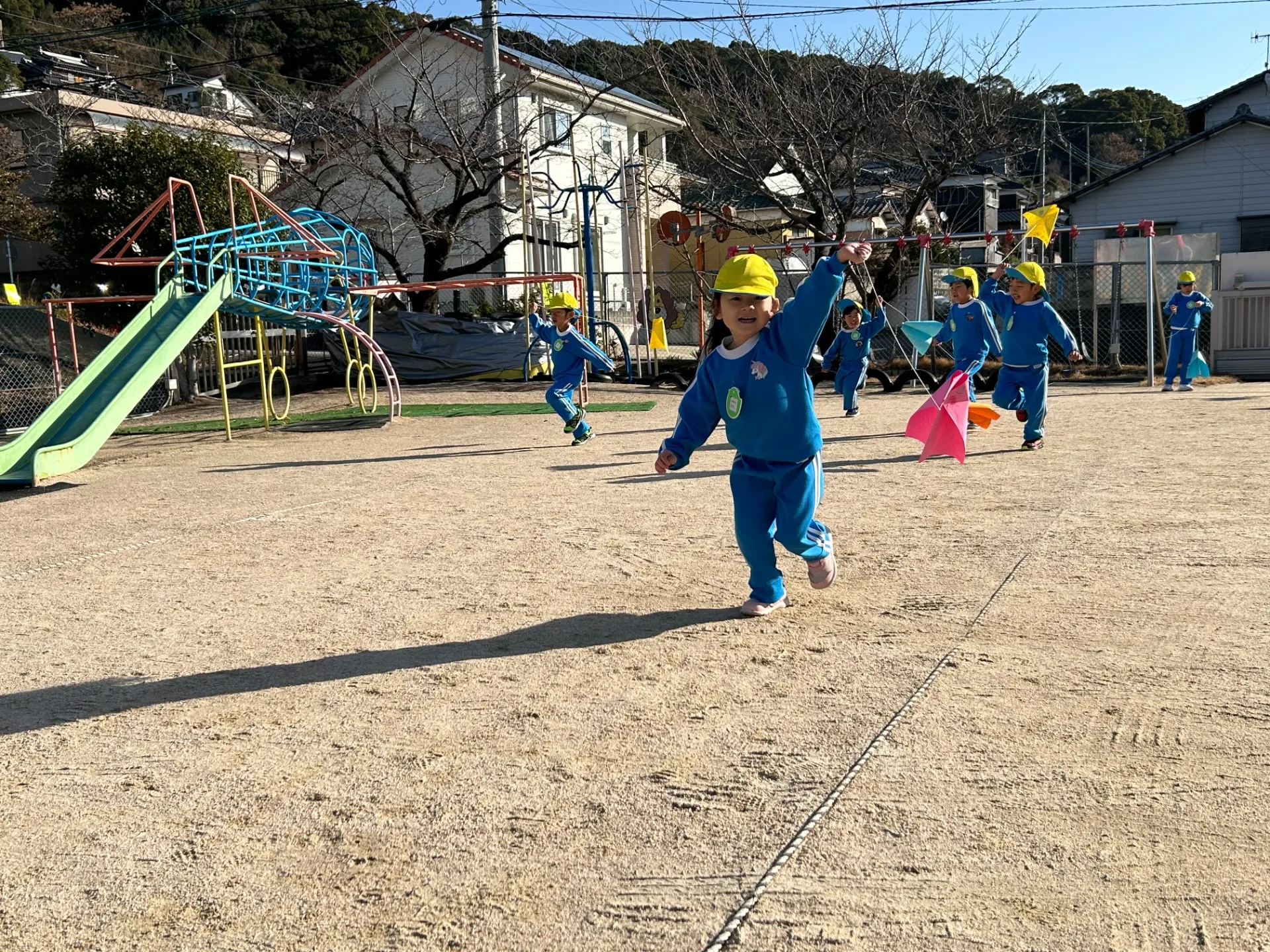 寒さに負けず、元気いっぱい遊び回っているB組さんです😊凧にお絵描きをして自分だけの凧を作りました✨お天気がいい日にお外に出て揚げるのを楽しみにしていました♪腕を高く上げて、思いっきり走り、一生懸命高く揚げていました🌈なかなか揚がらない子も紐を調節したり自分で考えながら取り組む姿がみられました