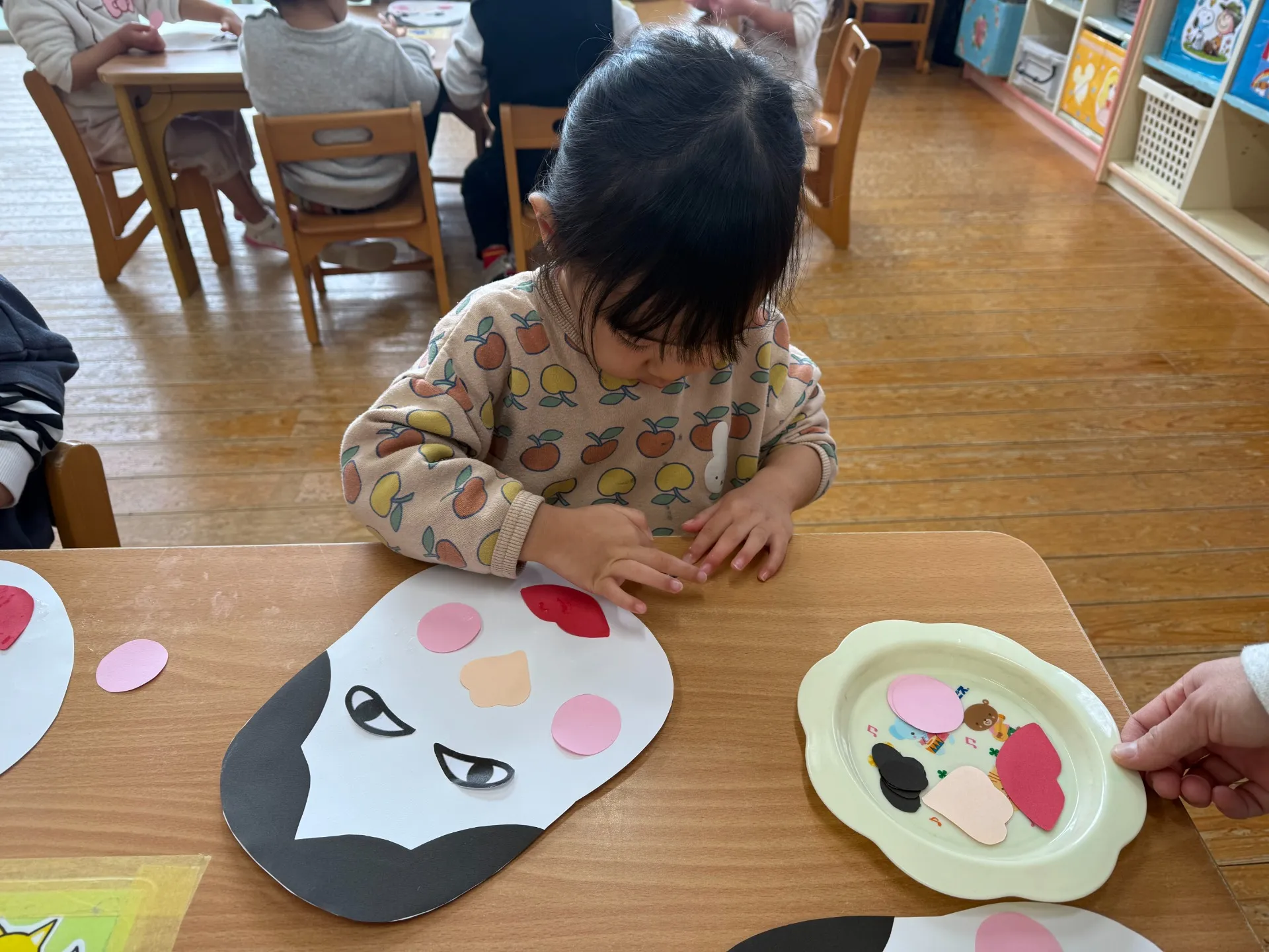 福笑いに挑戦しました♪目や口などのパーツをお手本見ながら「ここかな?」などと自分たちで貼っていく子ども達。出来上がった顔は一つひとつ表情が違い、思わず笑ってしまうような楽しい作品になりました😊「ママ!」と、完成した顔を見て嬉しそうに教えてくれる子の姿もありました