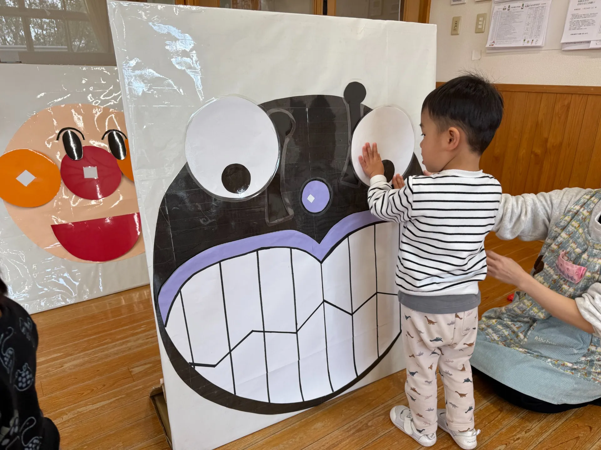 また、誕生日会で先生たちがした福笑いを子どもたちも実際にやってみました![]()