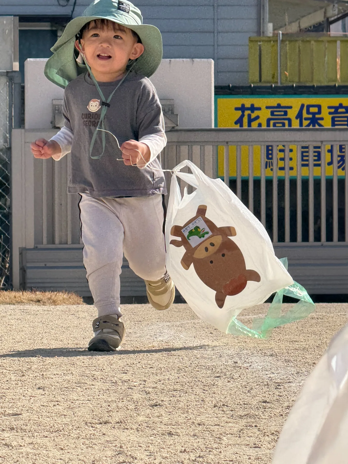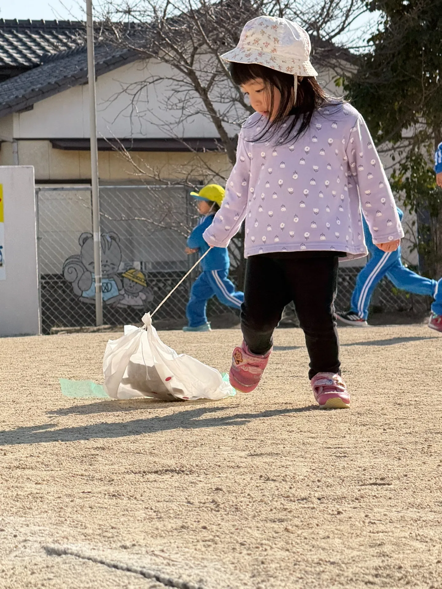 その凧を持って、よ~し!凧揚げするぞぉ~!と園庭を元気いっぱいに走り出したすみれ大組のお友だち❤