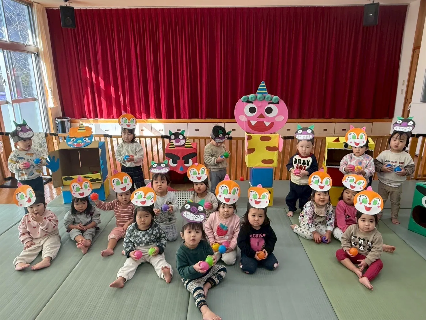 自分たちで製作した鬼のお面や帽子を被り、「おにはそと!ふくはうち!」と元気な声で豆を投げる子どもたちの姿が見られました✨