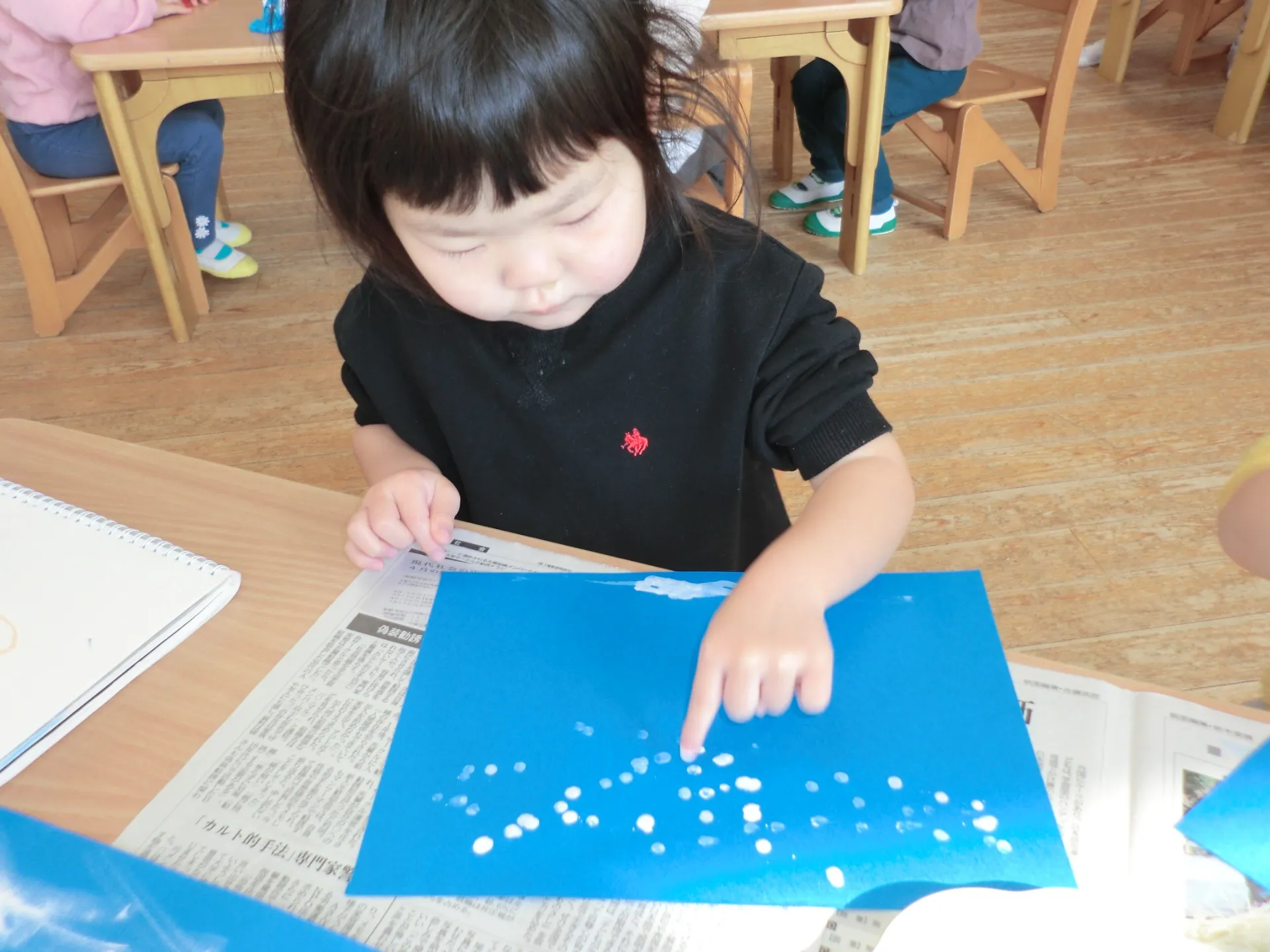 青色の画用紙に指先に絵の具をつけると、ポンポンと色をつけたり、なぐり描きしたり感触を楽しんでいました。
