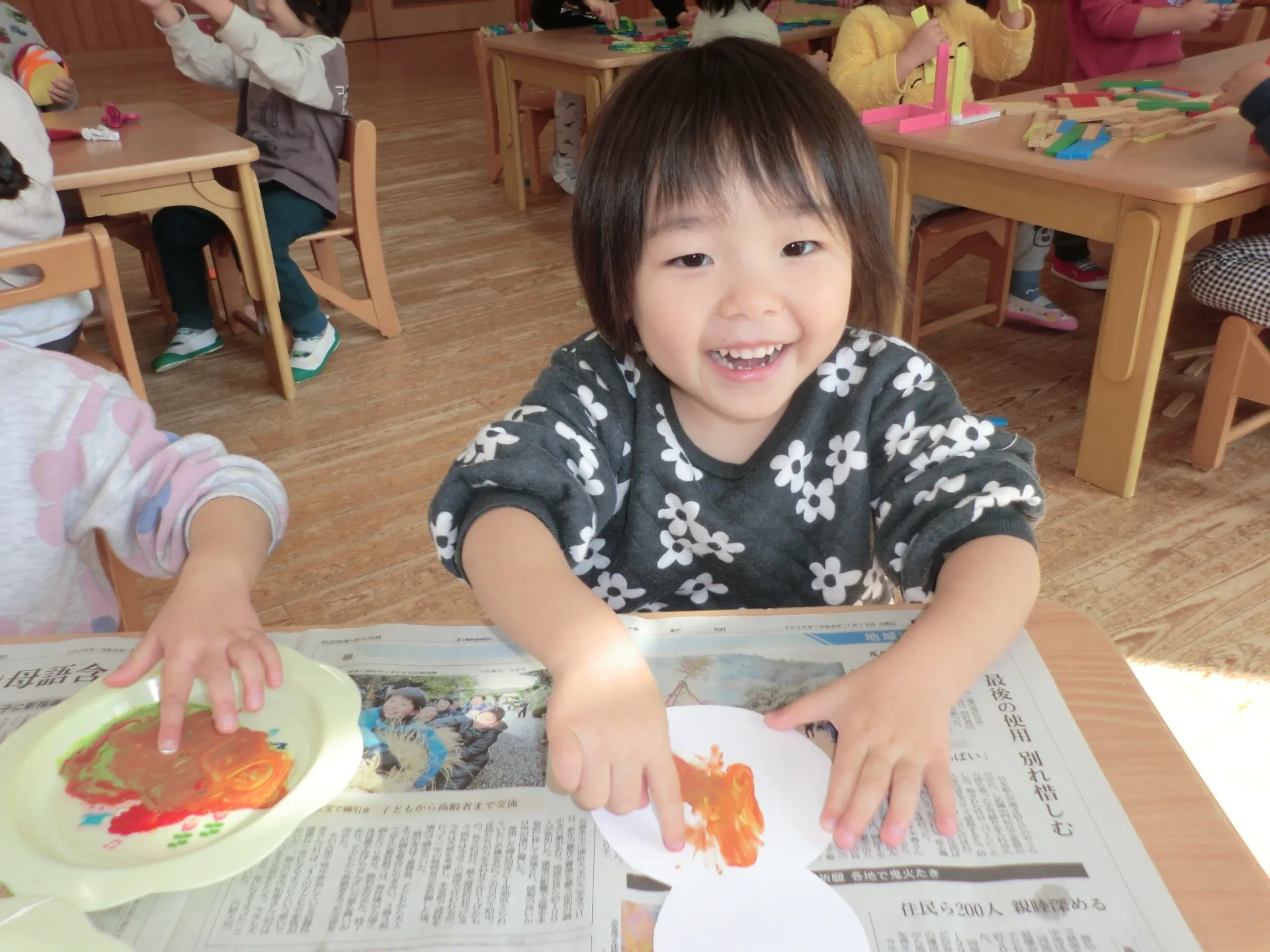 色をつけると画用紙を半分に折って手でこするとあら不思議‼色が混ざり素敵な色、模様になっていました。それを見た子どもたちから「わー」と声があがっていました。