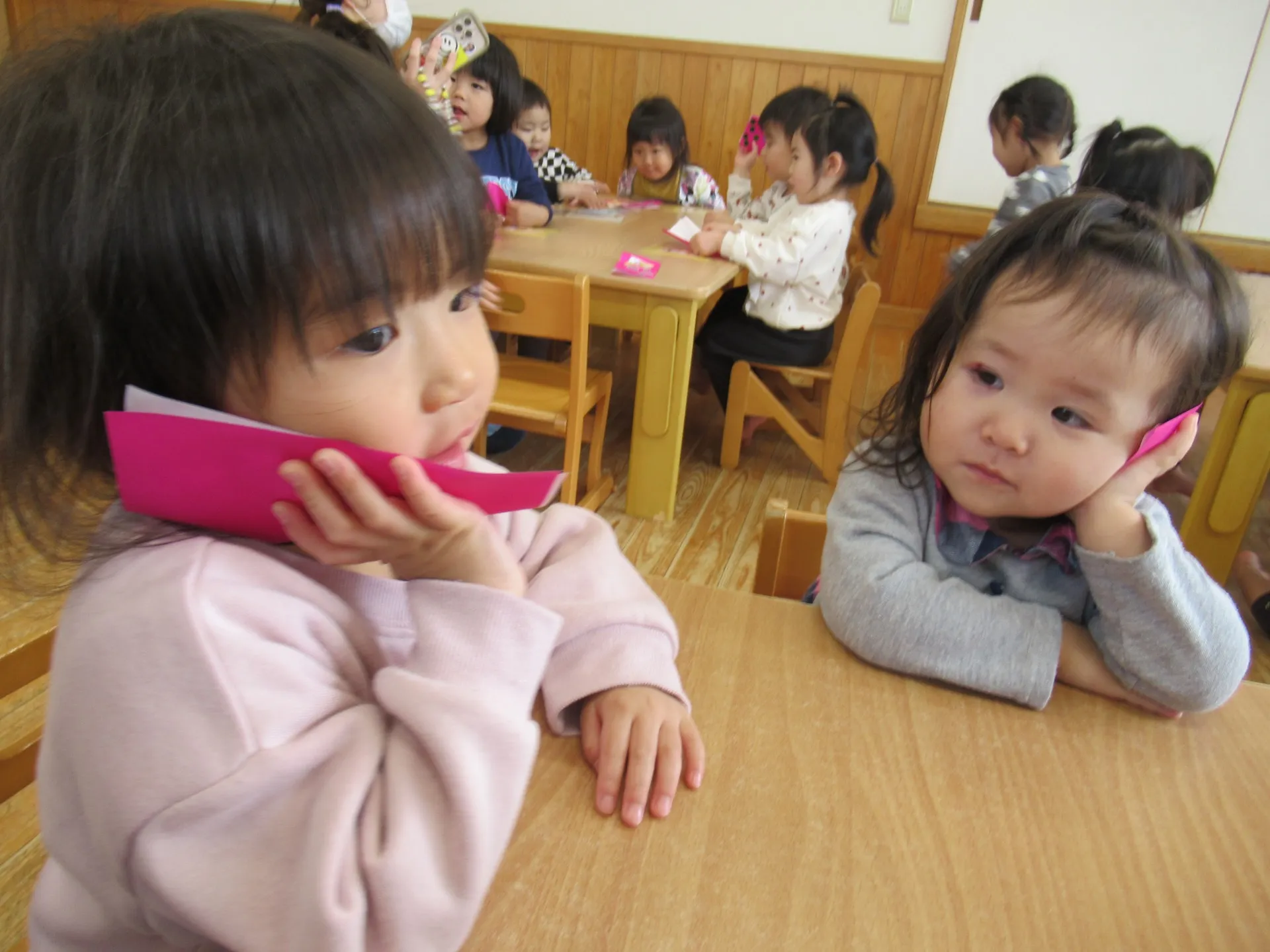 4月から、ゆり組になるお友だち✨ゆり組のお部屋にお邪魔して椅子に座って、折り紙で1回折りをしました。「はんぶんこ」と言いながら、電車🚃・ドア🚪・携帯電話📱を作りました。シール貼りも上手になり出来上がると近くのお友だちと「もしもし、うんうん😌」・「わかった~じゃあねーピッ」と楽しい会話が聞こえてきました。残りのすみれ大組も楽しく過ごしたいです。