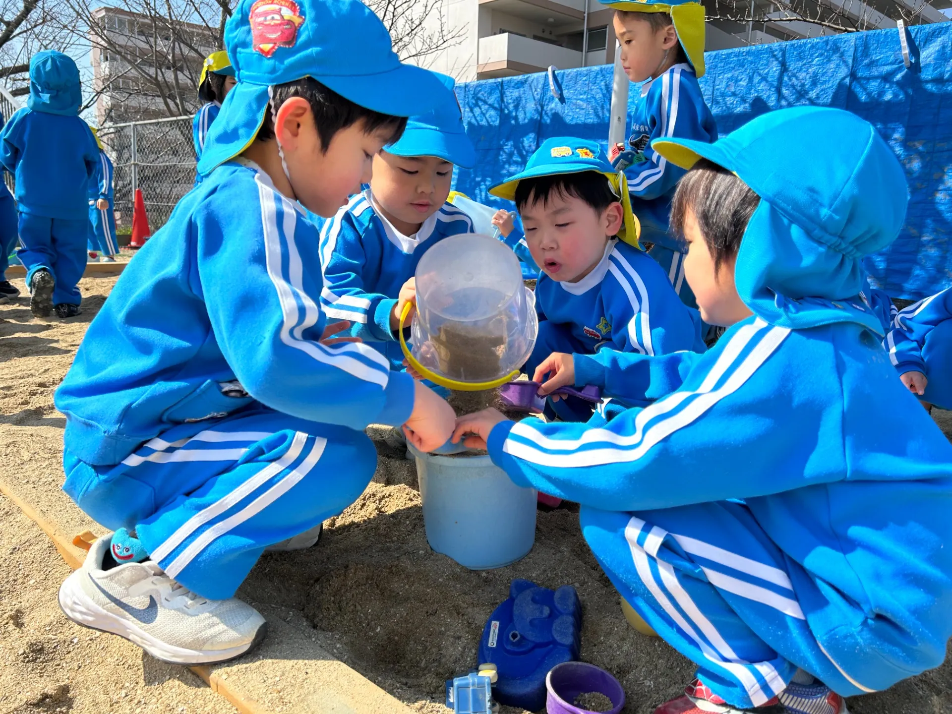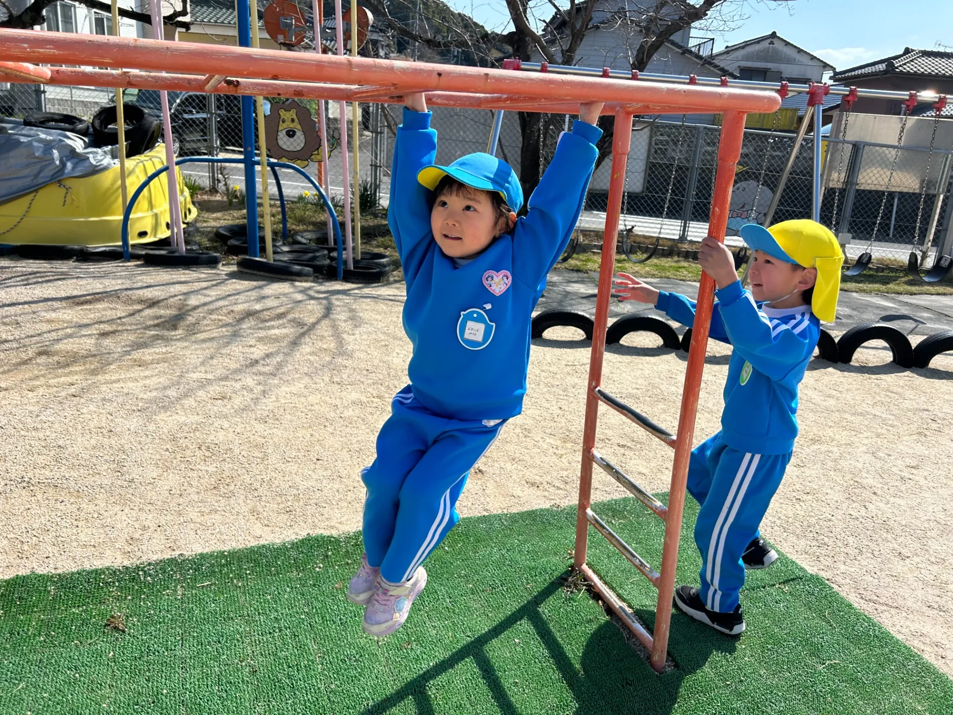 暖かい日差しの中で外遊びをしました☀珍しい形の石や貝殻を見つけては見せに来てくれます😄腕の力が強くなり、うんていに長くぶら下がれるようになって「見とって!見とって!!」と猛アピールされています😊💕砂場の男の子たちはお料理をしているようで「シチューだよ」と盛り上がっていました✨✨