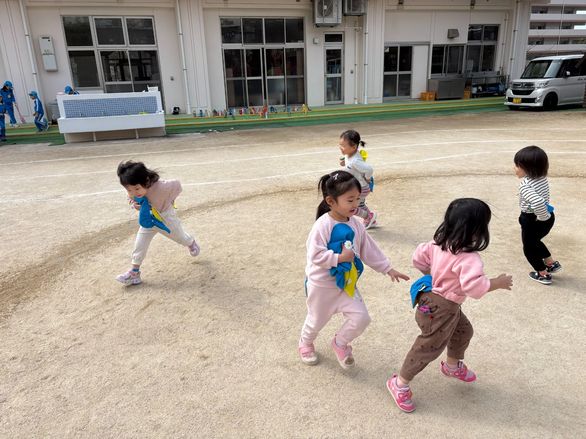3月になり、ポカポカのお天気な日にお外遊びを楽しんでいます♪最近は集団ゲームも楽しめるようになって、しっぽとりではお友だちに負けて涙することも・・・