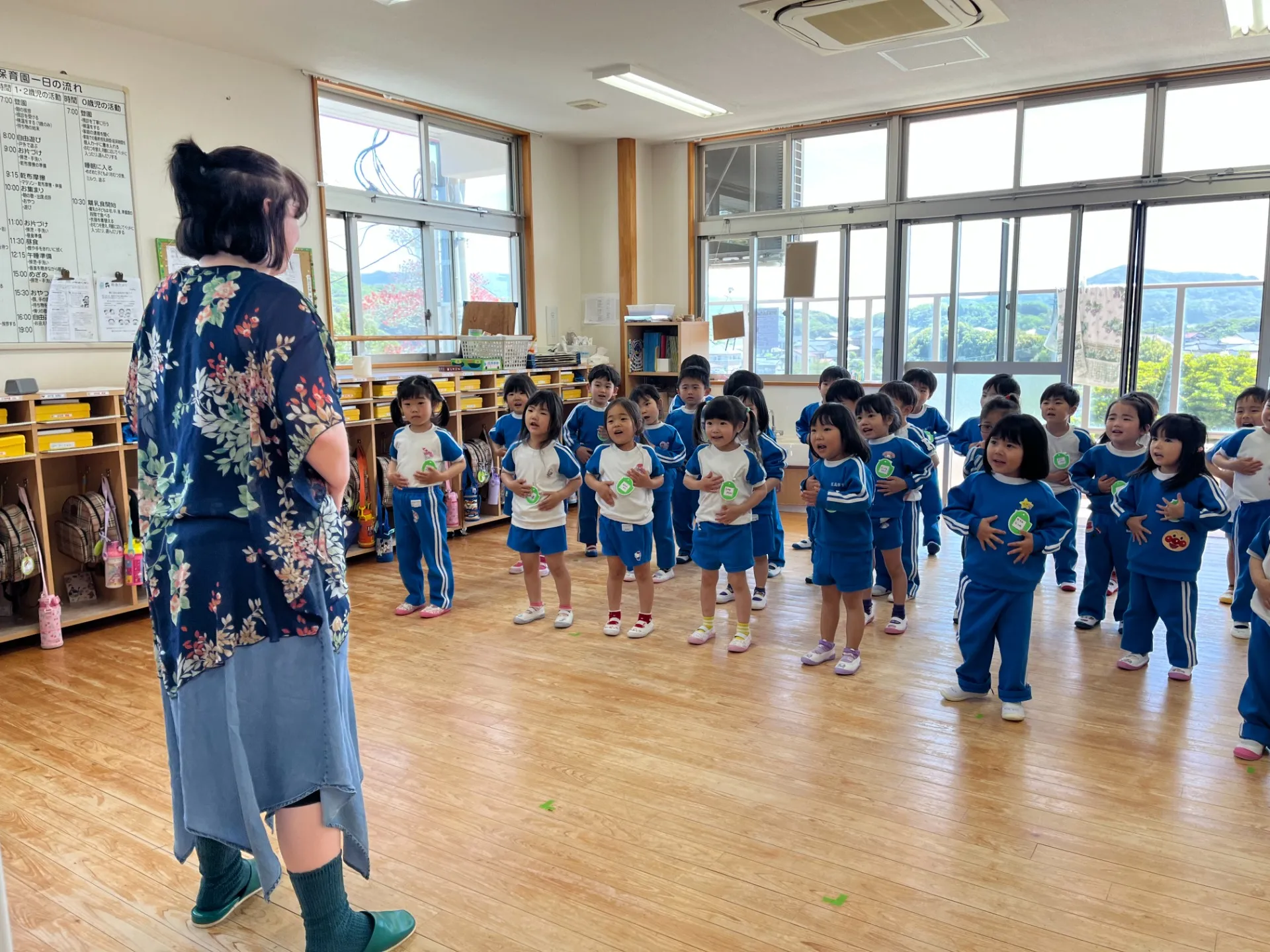 B組になり、英会話の活動がスタートしました☆初めての英語に最初はドキドキしている様子も見られましたが、講師のリン先生の明るい声掛けや楽しい歌で、みんなすぐに笑顔になっていました😊少しずつリン先生の英語を真似して、大きな声で歌ったり、発音する姿も見られるようになっています🎵これからも楽しみながら英語に触れられる時間を大切にしていきたいと思います✨
