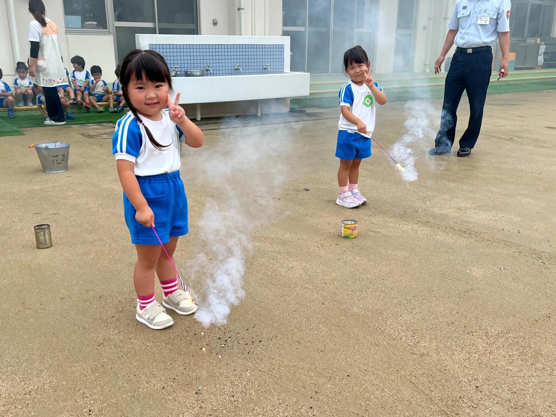 24日花火教室がありました消防署の方から花火をする時のお約束のお話しがあり、そのあとに実際に花火をしました「きれーい」「初めてした」ととっても嬉しそうな子。一人で花火を持ちちょっぴり緊張気味…
